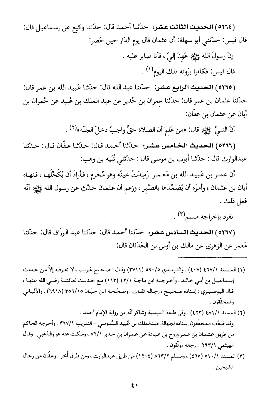 (٥٢٦٥) الحديث الرابع عشر: حدّثنا عبد اللَّه قال: حدّثنا عُبيد اللَّه بن عمر قال: حدّثنا عثمان بن عمر قال: حدّثنا عِمران بن حُدير عن عبد الملك بن عُبيد عن حُمران بن أبان عن عثمان بن عفّان: