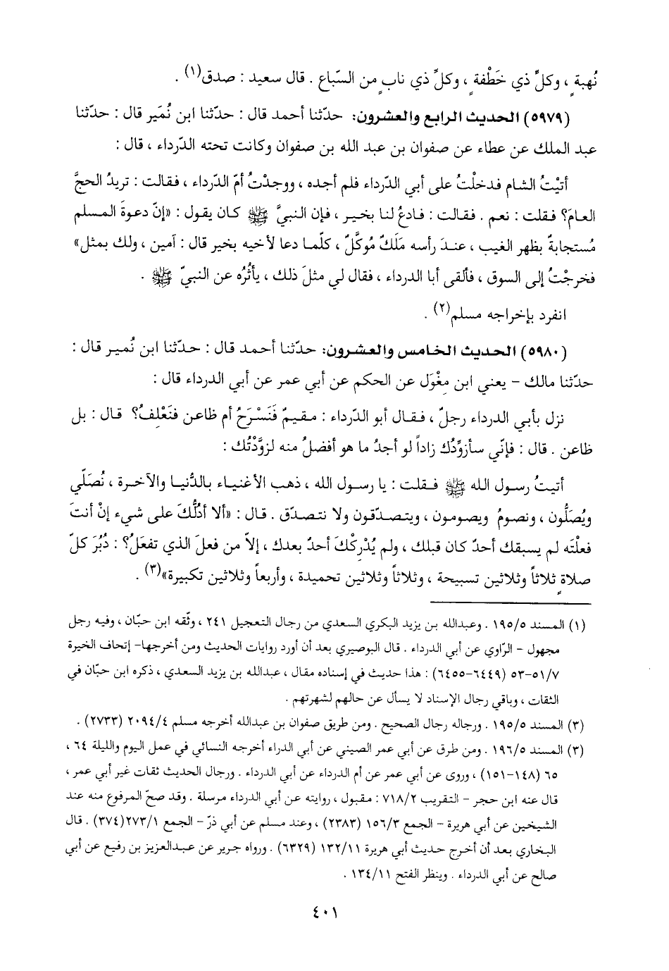 (٥٩٧٩) الحديث الرابع والعشرون: حدّثنا أحمد قال: حدّثنا ابن نُمَير قال: حدّثنا عبد الملك عن عطاء عن صفوان بن عبد اللَّه بن صفوان وكانت تحته الدّرداء، قال: