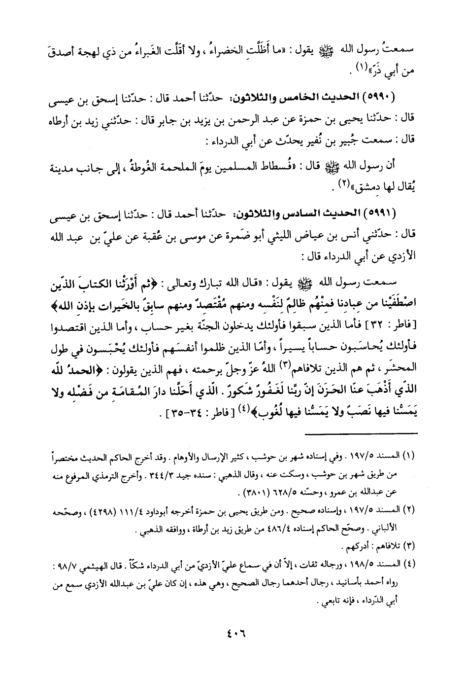 (٥٩٩٠) الحديث الخامس والثلاثون: حدّثنا أحمد قال: حدّثنا إسحق بن عيسى قال: حدّثنا يحيى بن حمزة عن عبد الرحمن بن يزيد بن جابر قال: حدّثني زيد بن أرطاه قال: سمعت جُبير بن نُفير يحدّث عن أبي الدرداء: