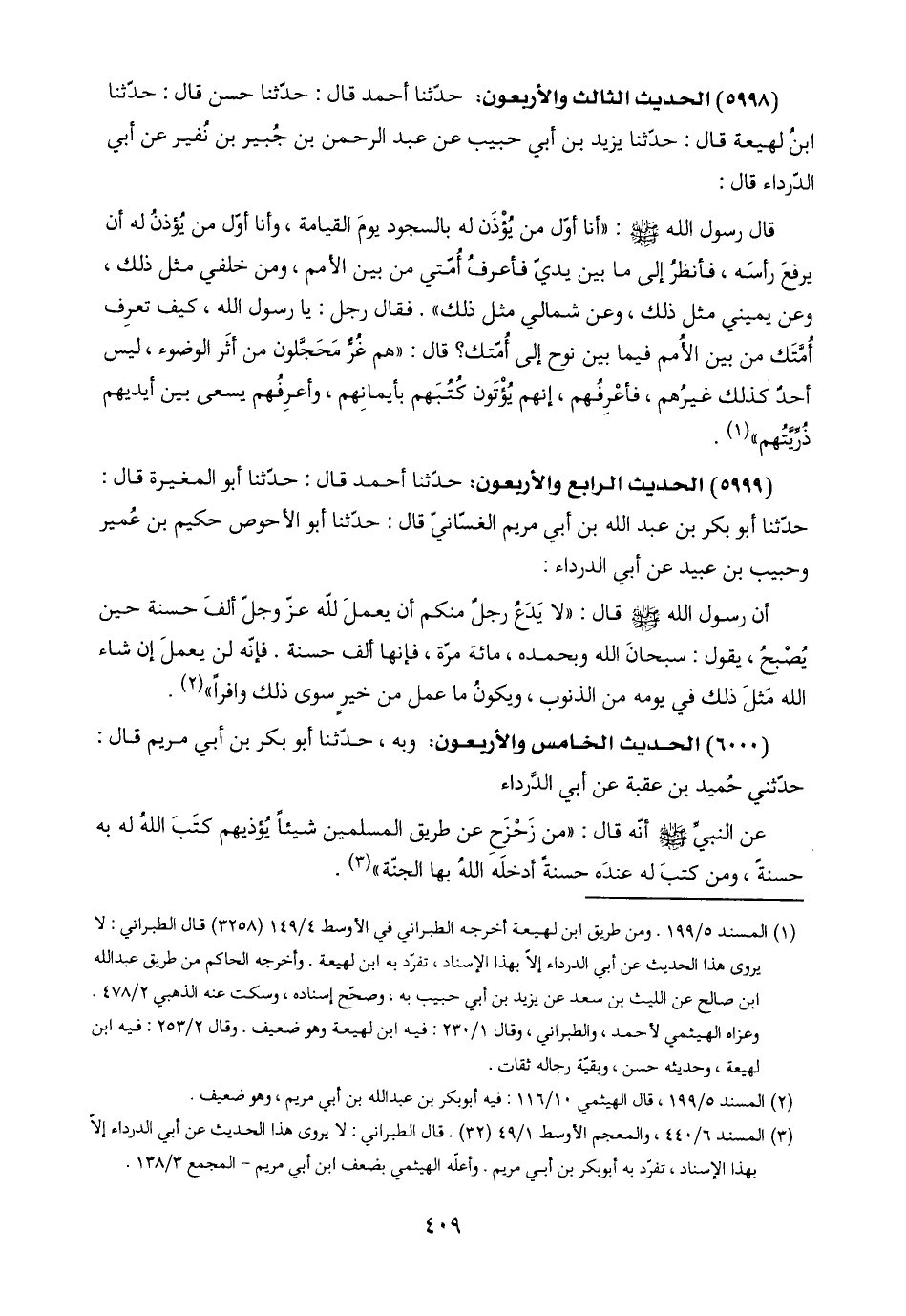 (٥٩٩٨) الحديث الثالث والأربعون: حدّثنا أحمد قال: حدّثنا حسن قال: حدّثنا ابنُ لهيعة قال: حدّثنا يزيد بن أبي حبيب عن عبد الرحمن بن جُبير بن نفير عن أبي الدّرداء قال: