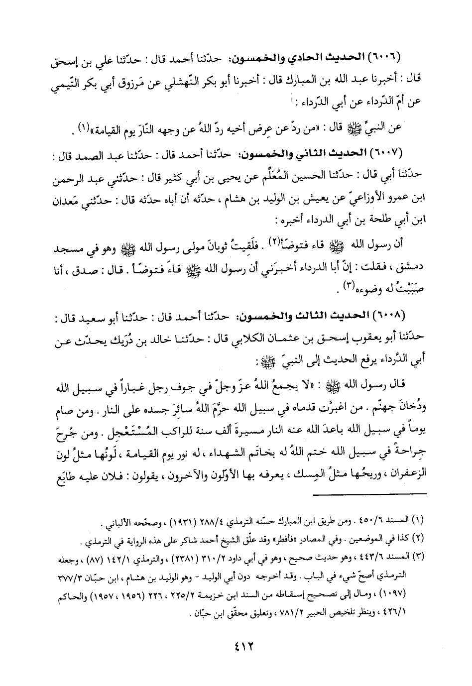 (٦٠٠٦) الحديث الحادي والخمسون: حدّثنا أحمد قال: حدّثنا علي بن إسحق قال: أخبرنا عبد اللَّه بن المبارك قال: أخبرنا أبو بكر النّهشلي عن مَرزوق أبي بكر التّيمي عن أمّ الدَّرداء عن أبي الدَّرداء: