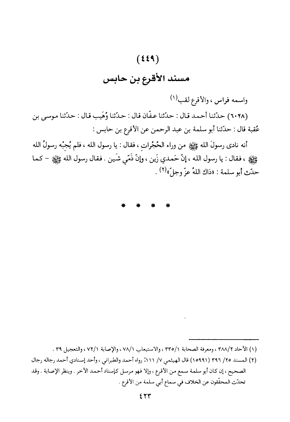 (٢) المسند ٢٥/ ٣٩٦ (١٥٩٩١) قال الهيثمي ٧/ ١١١: رواه أحمد والطبراني، وأحد إسنادي أحمد رجاله رجال الصحيح، إن كان أبو سلمة سمع من الأقرع، وإلا فهو مرسل كإسناد أحمد الآخر. وينظر الإصابة. وقد تحدّث المحقّقون عن الخلاف في سماع أبي سلمة من الأقرع.