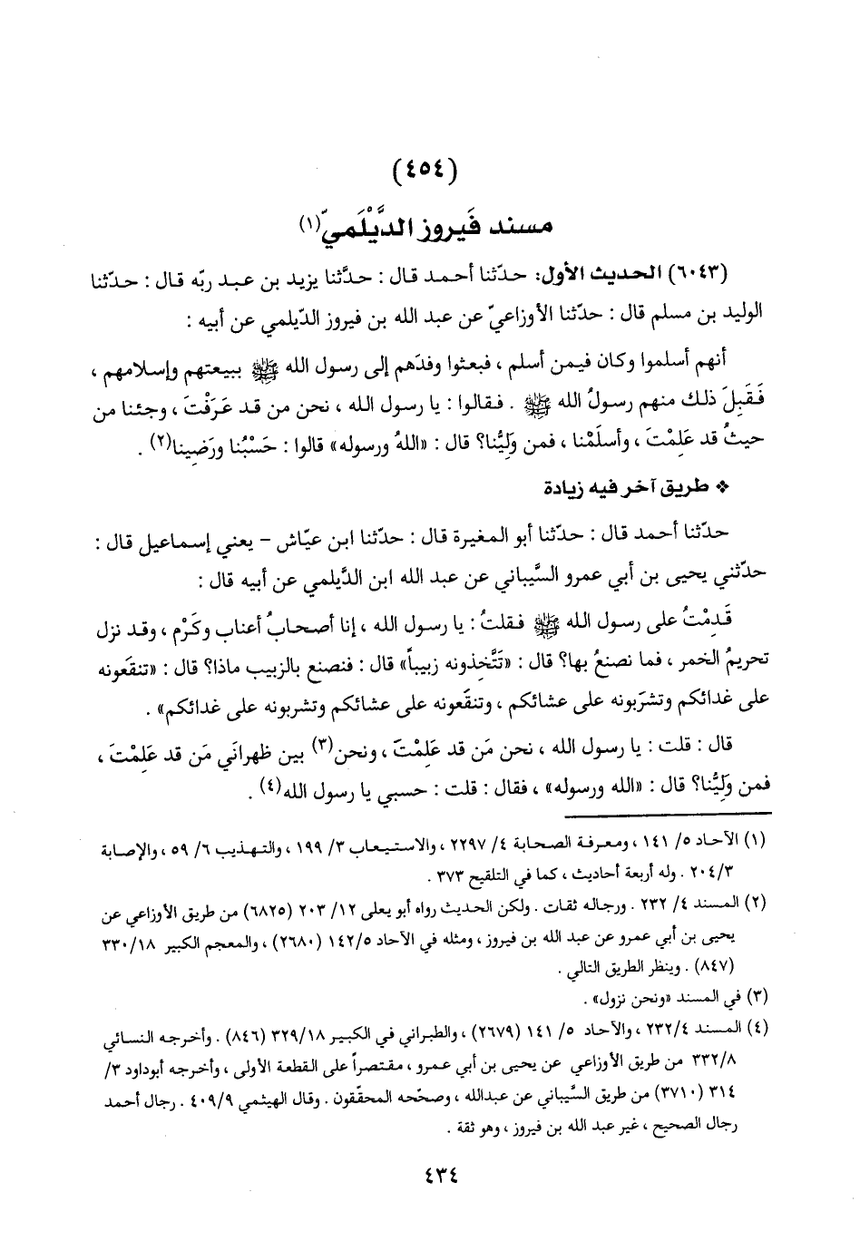 (٦٠٤٣) الحديث الأول: حدّثنا أحمد قال: حدّثنا يزيد بن عبد ربّه قال: حدّثنا الوليد بن مسلم قال: حدّثنا الأوزاعيّ عن عبد اللَّه بن فيروز الدّيلمي عن أبيه:
