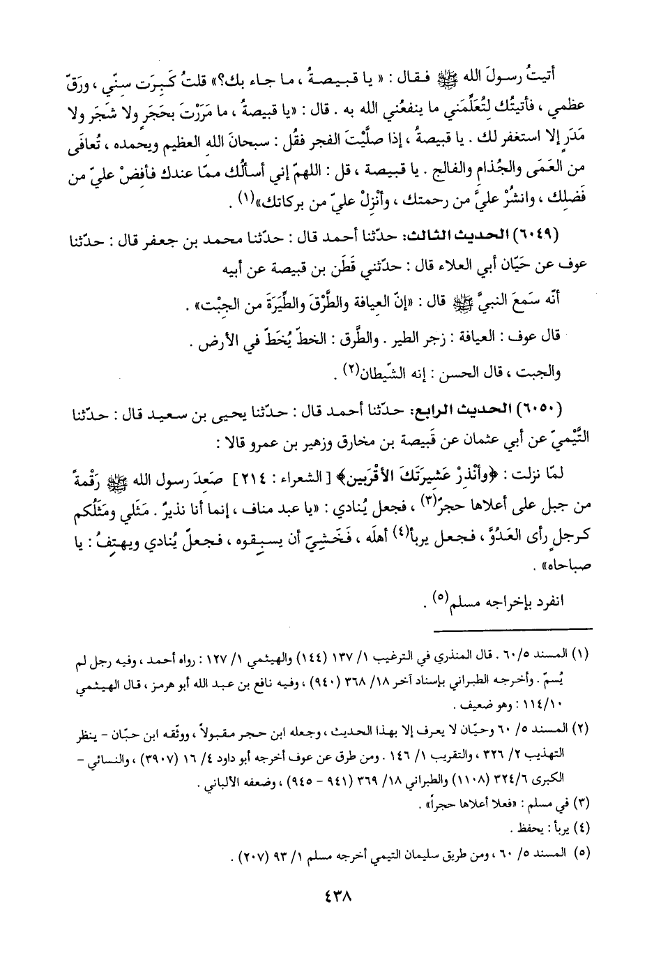 (٦٠٤٩) الحديث الثالث: حدّثنا أحمد قال: حدّثنا محمد بن جعفر قال: حدّثنا عوف عن حَيّان أبي العلاء قال: حدّثني قَطَن بن قبيصة عن أبيه: