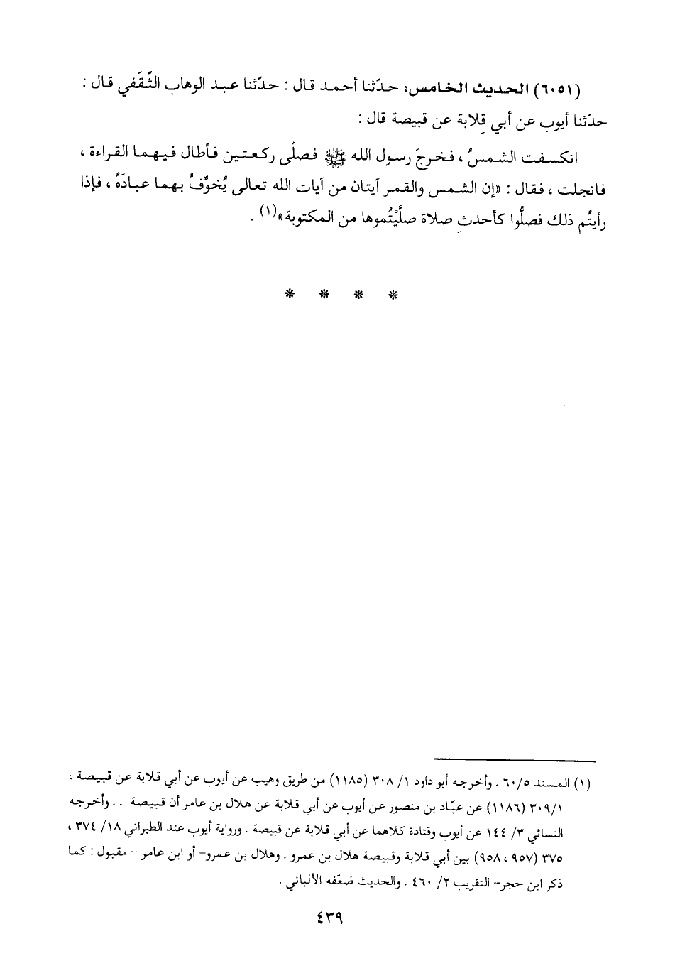 (١) المسند ٥/ ٦٠. وأخرجه أبو داود ١/ ٣٠٨ (١١٨٥) من طريق وهيب عن أيوب عن أبي قلابة عن قبيصة، ١/ ٣٠٩ (١١٨٦) عن عبّاد بن منصور عن أيوب عن أبي قلابة عن هلال بن عامر أن قبيصة. . وأخرجه النسائي ٣/ ١٤٤ عن أيوب وقتادة كلاهما عن أبي قلابة عن قبيصة. ورواية أيوب عند الطبراني ١٨/ ٣٧٤، ٣٧٥ (٩٥٧، ٩٥٨) بين أبي قلابة وقبيصة هلال بن عمرو. وهلال بن عمرو -أو ابن عامر- مقبول: كما ذكر ابن حجر - التقريب ٢/ ٤٦٠. والحديث ضعّفه الألباني.