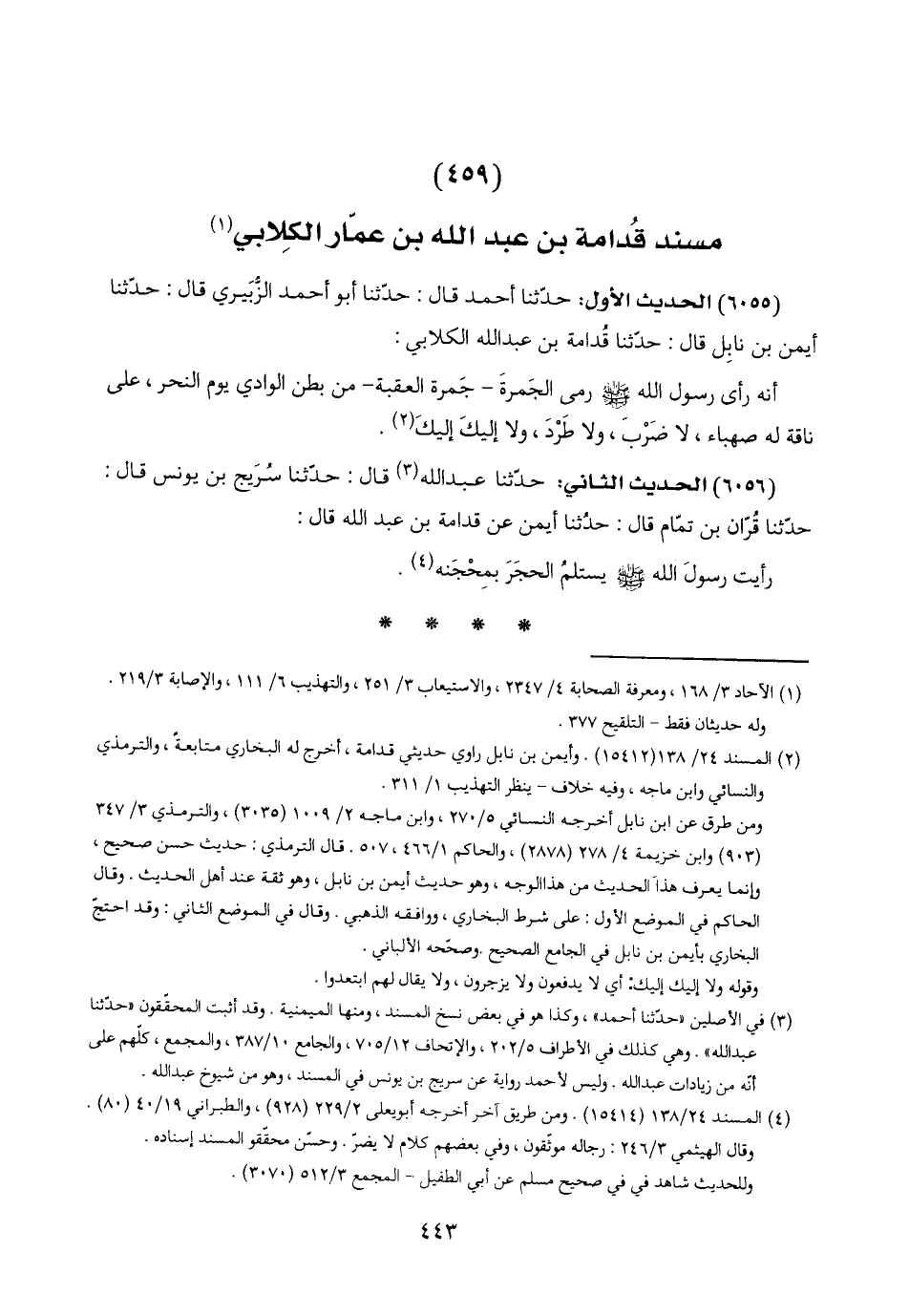 (٦٠٥٥) الحديث الأول: حدّثنا أحمد قال: حدّثنا أبو أحمد الزُّبَيري قال: حدّثنا أيمن بن نابِل قال: حدّثنا قُدامة بن عبد اللَّه الكلابي:
