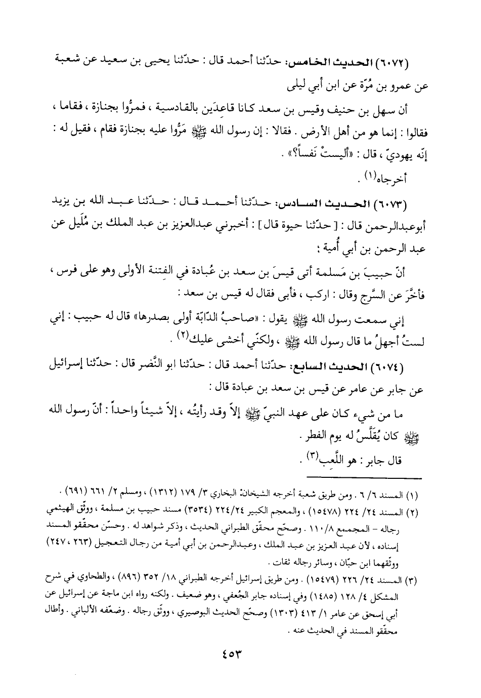 (٣) المسند ٢٤/ ٢٢٦ (١٥٤٧٩). ومن طريق إسرائيل أخرجه الطبراني ١٨/ ٣٥٢ (٨٩٦)، والطحاوي في شرح المشكل ٤/ ١٢٨ (١٤٨٥) وفي إسناده جابر الجُعفي، وهو ضعيف. ولكنه رواه ابن ماجة عن إسرائيل عن أبي إسحق عن عامر ١/ ٤١٣ (١٣٠٣) وصحّح الحديث البوصيري، ووثّق رجاله. وضعّفه الألباني. وأطال محقّقو المسند في الحديث عنه.