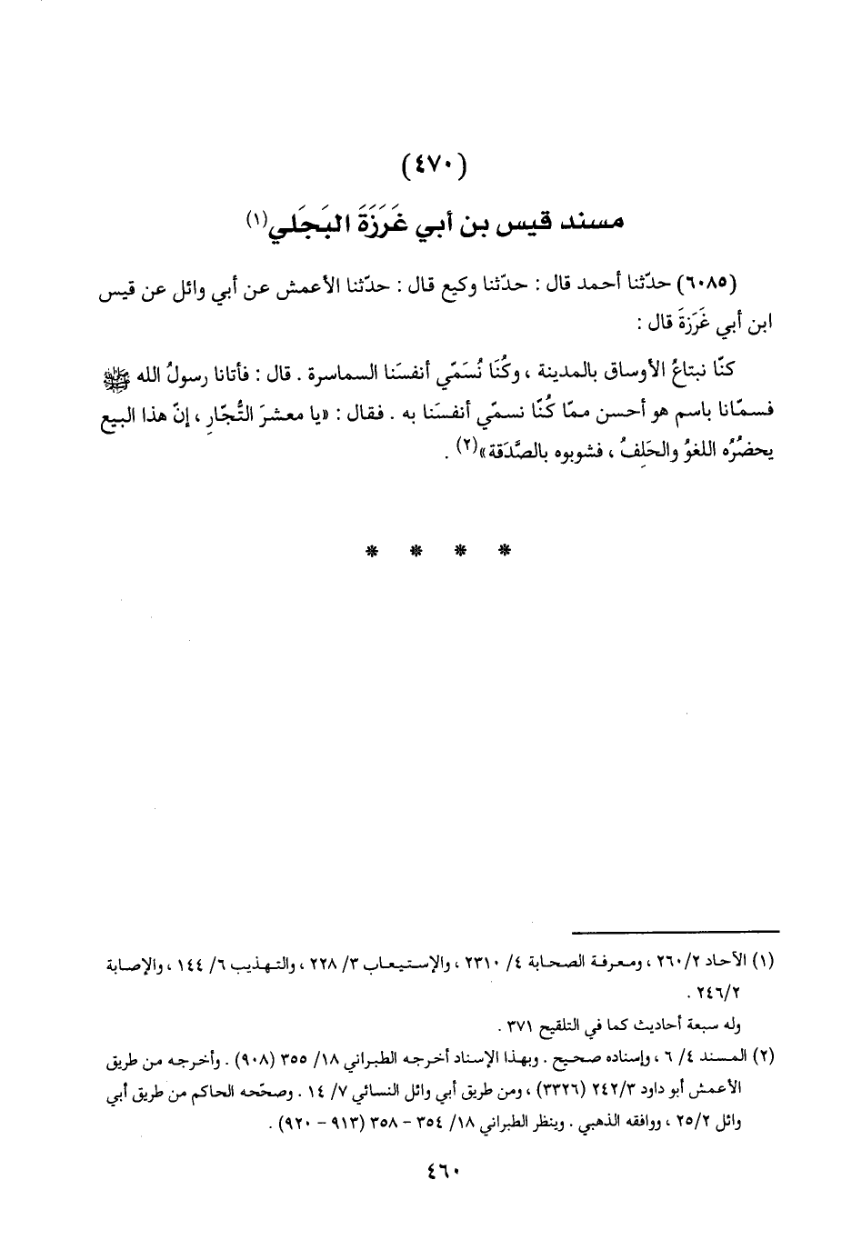 (٤٧٠) مسند قيس بن أبي غَرَزَةَ البَجَلي (١)