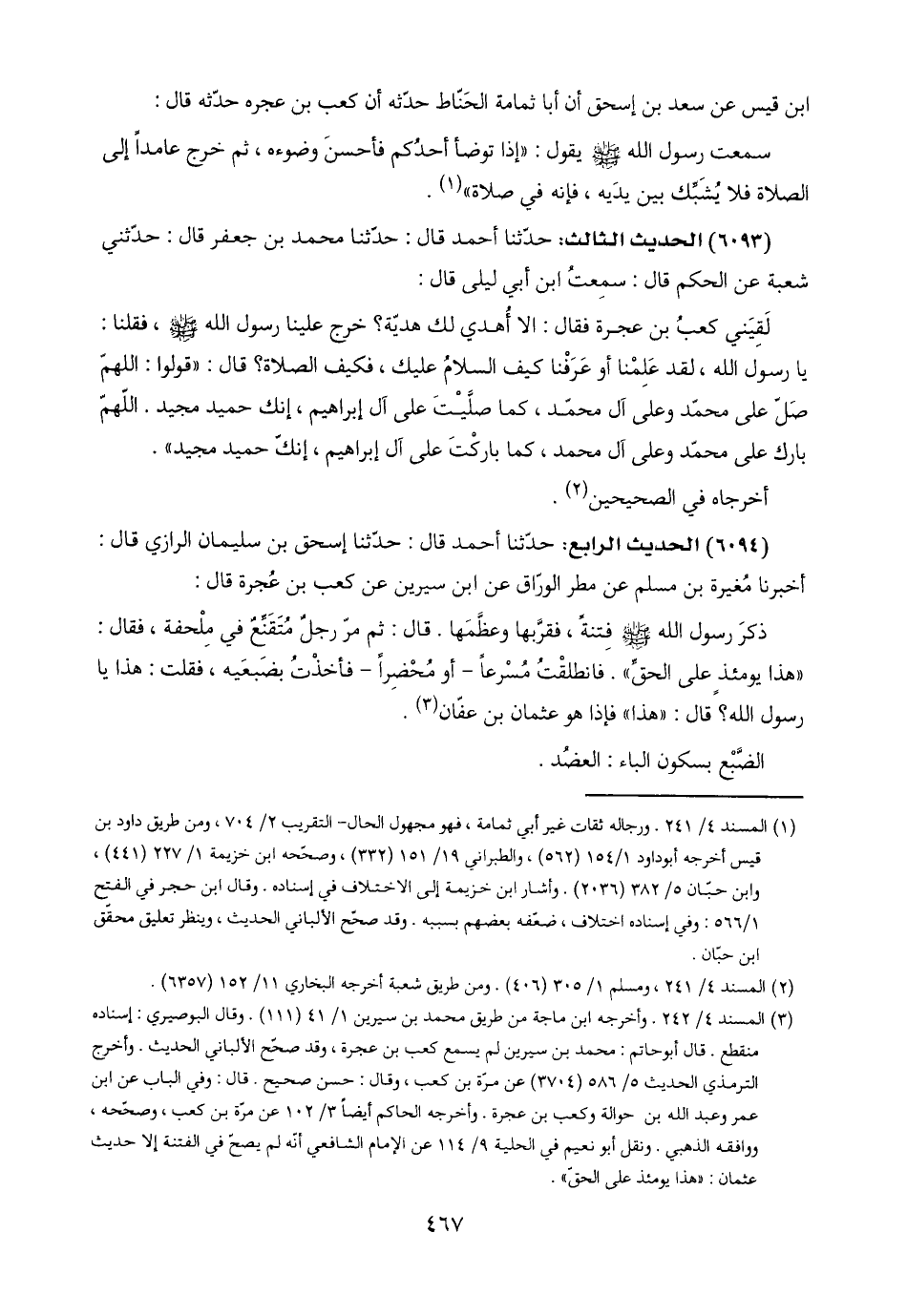 (٦٠٩٤) الحديث الرابع: حدّثنا أحمد قال: حدّثنا إسحق بن سليمان الرازي قال: أخبرنا مُغيرة بن مسلم عن مطر الورّاق عن ابن سيرين عن كعب بن عُجرة قال: