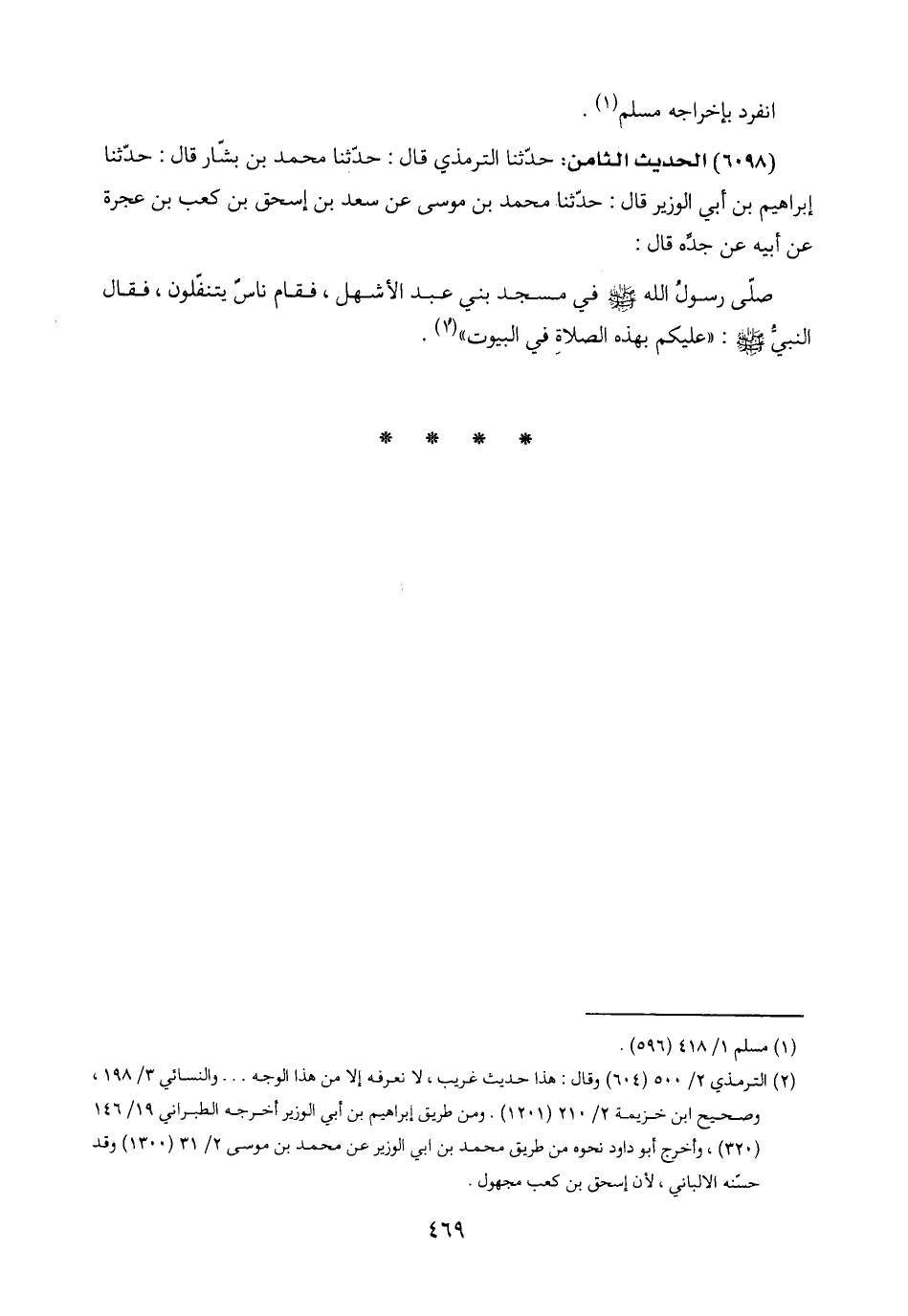 (٦٠٩٨) الحديث الثامن: حدّثنا الترمذي قال: حدّثنا محمد بن بشّار قال: حدّثنا إبراهيم بن أبي الوزير قال: حدّثنا محمد بن موسى عن سعد بن إسحق بن كعب بن عجرة عن أبيه عن جدّه قال: