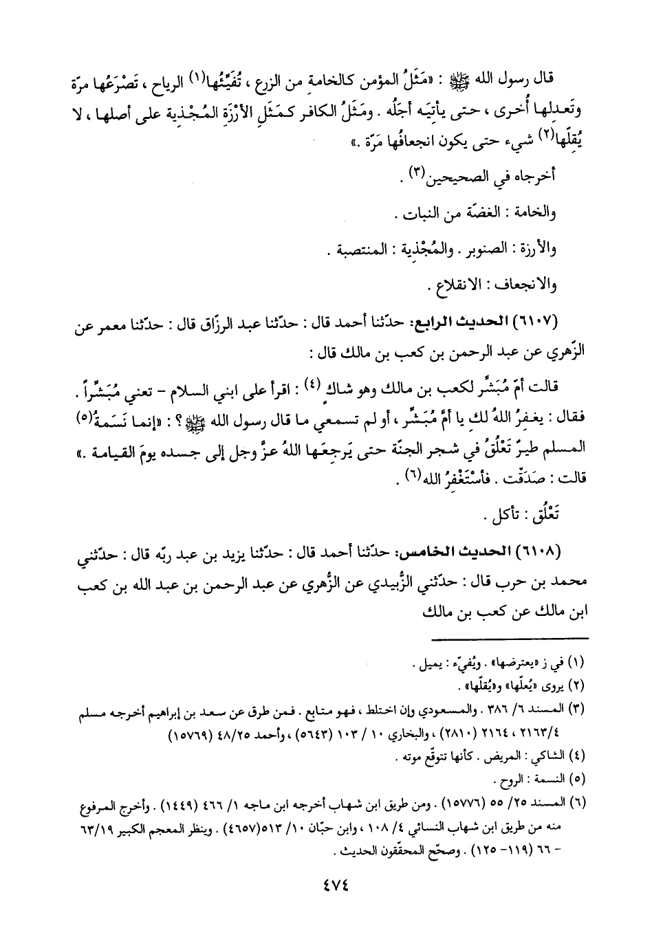 قالت أمّ مُبَشِّر لكعب بن مالك وهو شاكٍ (٤): اقرأ على ابني السلام - تعني مُبَشِّرًا. فقال: يغفِرُ اللَّهُ لكِ يا أُمَّ مُبَشِّر، أو لم تسمعي ما قال رسول اللَّه -صلى اللَّه عليه وسلم-؟ : "إنما نَسَمةُ (٥) المسلم طيرٌ تَعْلُقُ في شجر الجنّة حتى يَرجعَها اللَّهُ عزّ وجلّ إلى جسده يومَ القيامة". قالت: صَدَقْت. فأسْتَغْفِرُ اللَّه (٦).