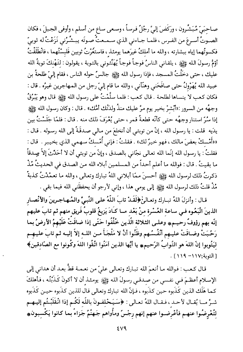 صاحِبَي مُبَشِّرون، ورَكَضَ إليَّ رجُلٌ فرسًا، وسعى ساع من أسلم، وأوفى الجبلَ، فكان الصوتُ أسرعَ من الفرس، فلما جاءني الذي سمعتُ صوتَه يبشِّرُني نَزَعْتُ له ثوبيّ فكسوتُهما إياه ببشارته، واللَّه ما أملِكُ غيرَهما يومئذٍ، فاستَعَرْتُ ثوبين فَلبِسْتُهما، فانْطَلَقْتُ أؤمُّ رسولَ اللَّه -صلى اللَّه عليه وسلم-، يلقاني الناسُ فوجًا فوجًا يُهَنِّئوني بالتوبة، يقولون: لِتَهْنِكَ توبةُ اللَّه عليك، حتى دخَلْتُ المسجد، فإذا رسول اللَّه -صلى اللَّه عليه وسلم- جالسٌ حوله النّاس، فقام إليَّ طلحةُ بن عبيد اللَّه يُهَرْوِلُ حتى صافَحَني وهنَّأني، واللَّه ما قام إليَّ رجل من المهاجرين غيرُه. قال: فكان كعب لا ينساها لطلحة. قال كعب: فلما سلَّمْتُ على رسول اللَّه -صلى اللَّه عليه وسلم- قال وهو يَبْرُقُ وجهُه من السرور: "أبْشِرْ بخير يوم مرَّ عليك منذُ ولدَتْك أُمُّك". قال: وكان رسول اللَّه -صلى اللَّه عليه وسلم- إدا سُرَّ استنار وجهُه حتى كأنَّه قطعةُ قمر، حتى يُعْرَفَ ذلك منه. قال: فلمّا جَلَسْتُ بين يدَيه قلت: يا رسول اللَّه، إنّ من توبتي أن أنخلعَ من مالي صدقَةً إلى اللَّه رسوله. قال: "أَمْسِكْ بعضَ مالك، فهو خيرٌ لك". فقلتُ: فإني أُمْسِكُ سهمي الذي بخيبر. قال: فقلتُ: يا رسول اللَّه إنّما اللَّه تعالى نجّاني بالصدق، وإنّ من توبتي أن لا أحَدِّثَ إلّا صِدقًا ما بقيتُ. قال: فواللَّه ما أعلم أحدًا من المسلمين أبلاه اللَّه من الصدق في الحديثُ مُذْ ذكرتُ ذلك لرسول اللَّه -صلى اللَّه عليه وسلم- أحسنَ ممّا أبلاني اللَّهُ تبارك وتعالى، واللَّه ما تعمَّدْتُ كذبةً مُذْ قلتُ ذلك لرسول اللَّه -صلى اللَّه عليه وسلم- إلى يومي هذا، وإني لأرجو أن يحفظَني اللَّه فيما بقي.