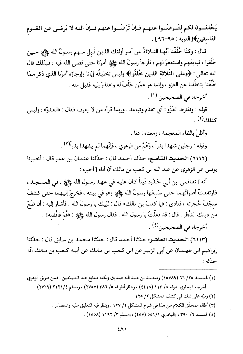 قال: وكنّا خُلِّفْنا أيها الثلاثةُ عن أمر أولئك الذين قَبِل منهم رسولُ اللَّه -صلى اللَّه عليه وسلم- حين حَلَفوا، فبايَعَهم واستغفرَ لهم، فأرجأ رسولُ اللَّه -صلى اللَّه عليه وسلم- أمرَنا حتى قضى اللَّه فيه، فبذلك قال اللَّه تعالى: {وَعَلَى الثَّلَاثَةِ الَّذِينَ خُلِّفُوا} وليس تخليفُه إيّانا وإرجاؤه أمرَنا الذي ذكر ممّا خُلِّفْنا بتخلُّفنا عن الغزو، وإنما هو عمّن حَلَفَ له واعتذر إليه فقبل منه.