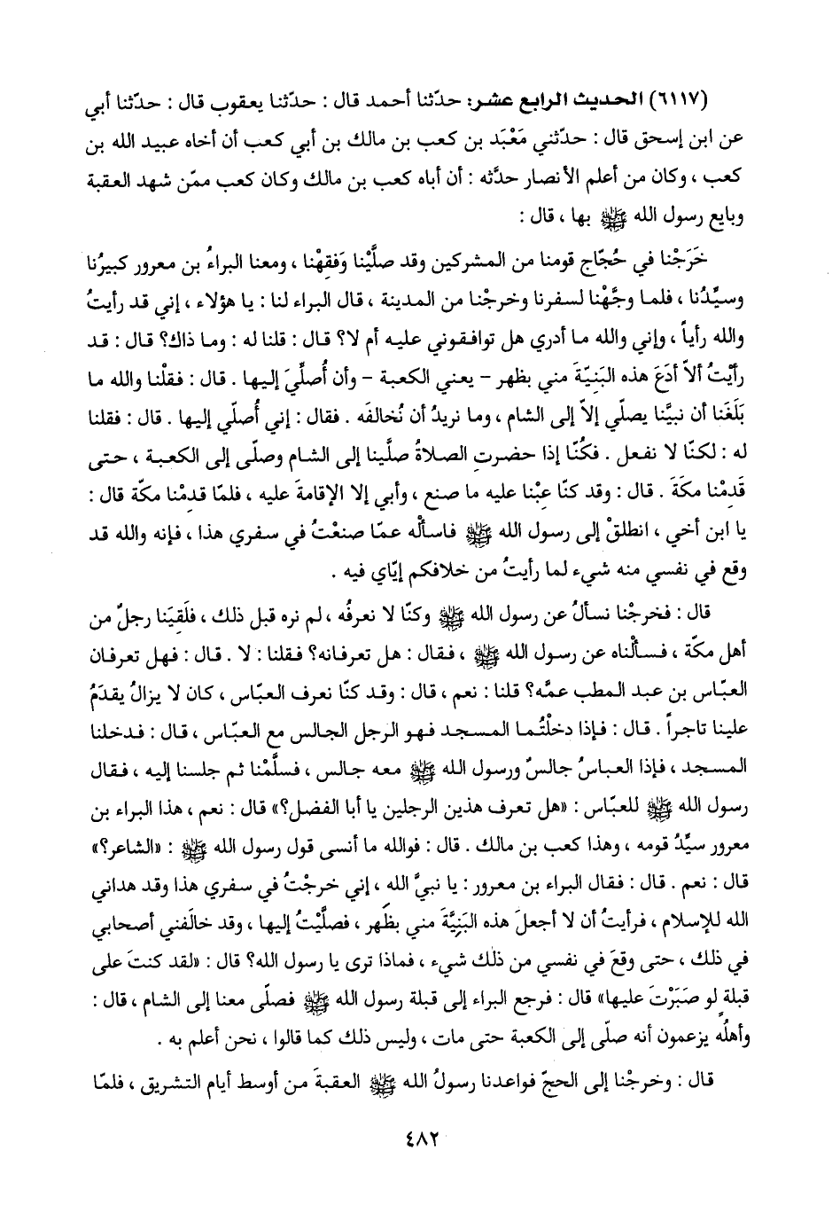 (٦١١٧) الحديث الرابع عشر: حدّثنا أحمد قال: حدّثنا يعقوب قال: حدّثنا أبي عن ابن إسحق قال: حدّثني مَعْبَد بن كعب بن مالك بن أبي كعب أن أخاه عبيد اللَّه بن كعب، وكان من أعلم الأنصار حدَّثه: أن أباه كعب بن مالك وكان كعب ممّن شهد العقبة وبايع رسول اللَّه -صلى اللَّه عليه وسلم- بها، قال: