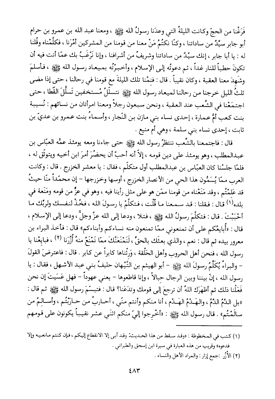 قال: فاجتمعنا بالشِّعب ننتظرُ رسول اللَّه -صلى اللَّه عليه وسلم- حتى جاءنا ومعه يومئذ عمُّه العبّاس بن عبد المطلب، وهو يومئذ على دين قومه، إلّا أنّه أحبَّ أن يحضُرَ أمرَ ابن أخيه ويتوثّق له، فلمّا جلسْنا كان العبّاس بن عبد المطلب أول متكلّم، فقال: يا معشر الخزرج. قال: وكانت العرب ممّا يُسَمُّون هذا الحي من الأنصار الخزرج، أوسها وخزرجها - إنّ محمّدًا منّا حيثُ قد عَلِمْتُم، وقد مَنَعْناه من قومنا ممّن هو على مثل رأينا فيه، وهو في عزٍّ من قومه ومَنَعة في بلده (١) قال: فقلنا: قد سمعنا ما قُلْت، فتكلَّمْ يا رسولَ اللَّه، فخُذْ لنفسك ولربِّك ما أحْبَبْتَ. قال: فتكلَّمَ رسولُ اللَّه -صلى اللَّه عليه وسلم-، فتلا، ودعا إلى اللَّه عزّ وجلّ، ودعا إلى الإسلام، قال: "أُبايعُكم على أن تمنعوني ممّا تمنعون منه نساءكم وأبناءكم" قال: فأخذ البراء بن معرور بيده ثم قال: نعم، والذي بعثَك بالحقِّ، لَنَمْنَعَنَّكَ ممّا نَمْنَعُ منهُ أُزُرَنا (٢)، فبايِعْنا يا رسول اللَّه، فنحن أهل الحروب وأهل الحَلْقة، وَرِثْناها كابرًا عن كابر. قال: فاعترضَ القولَ -والبراءُ يُكَلِّمُ رسولَ اللَّه -صلى اللَّه عليه وسلم- أبو الهيثم بن التَّيْهان حليفُ بني عبد الأشهل، فقال: يا رسول اللَّه، إنّ بيننا وبين الرجال حِبالًا، وإنا قاطعوها -يعني عهودًا- فهل عَسَيتَ إن نحن فَعَلْنا ذلك ثم أظهَرَك اللَّهُ أن ترجعَ إلى قومك وتدَعَنا؟ قال: فتبسَّمَ رسول اللَّه -صلى اللَّه عليه وسلم- ثم قال: "بل الدَّمُ الدَّمُ، والهَدْمُ الهَدْم، أنا منكم وأنتم منّي، أحاربُ من حارَبْتُم، وأسالِمُ من سالَمْتُم". قال رسول اللَّه -صلى اللَّه عليه وسلم-: "أخْرِجوا إليّ منكم اثنَي عشر نقيبًا يكونون على قومهم