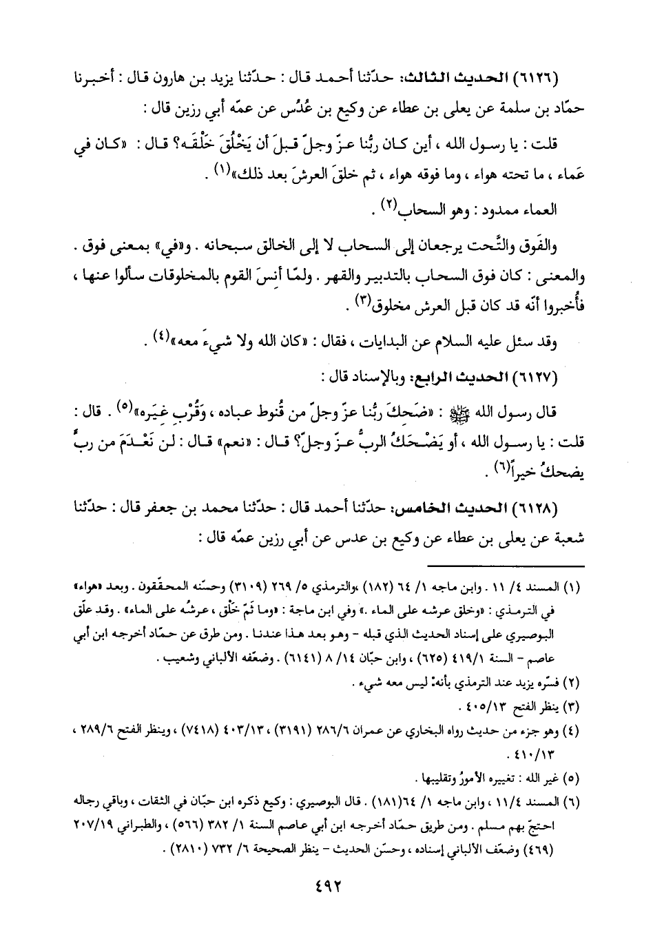 (١) المسند ٤/ ١١. وابن ماجة ١/ ٦٤ (١٨٢)، والترمذي ٥/ ٢٦٩ (٣١٠٩) وحسّنه المحقّقون. وبعد "هواء" في الترمذي: "وخلق عرشه على الماء." وفي ابن ماجة: "وما ثَمّ خَلْق، عرشُه على الماء". وقد علّق البوصيري على إسناد الحديث الذي قبله - وهو بعد هذا عندنا. ومن طرق عن حمّاد أخرجه ابن أبي عاصم - السنة ١/ ٤١٩ (٦٢٥)، وابن حبّان ٨/ ١٤ (٦١٤١). وضعّفه الألباني وشعيب.