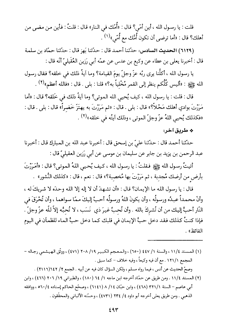 (٦١٢٩) الحديث السادس: حدّثنا أحمد قال: حدّثنا بَهز قال: حدّثنا حمّاد بن سلمة قال: أخبرنا يعلى بن عطاء عن وكيع بن عدس عن عمّه أبي رَزين العُقَيليّ أنّه قال: