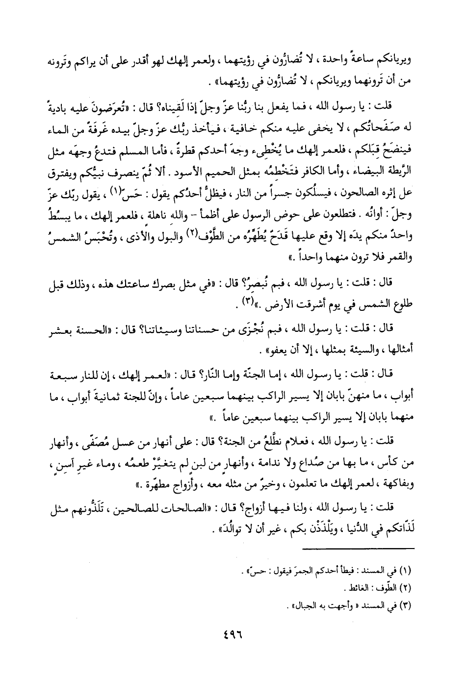 قال: قلت: يا رسول اللَّه، فبم نُبصِرُ؟ قال: "في مثل بصرك ساعتك هذه، وذلك قبل طلوع الشمس في يوم أشرقت الأرض". (٣).