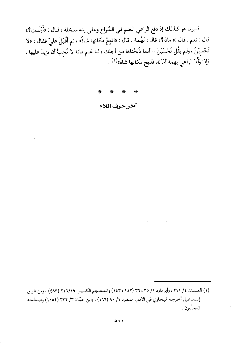 فبينا هو كذلك إذ دفع الراعي الغنم في المُراح وعلى يده سخلة، قال: "أَوَلَدت؟ " قال: نعم. قال: "ماذا؟ " قال: بَهْمة. قال: "اذبحْ مكانها شاةً"، ثم أقْبَلَ عليّ فقال: "لا تَحْسِبَن، ولم يقل تَحْسبَنّ - أنما ذَبَحْناها من أجلك، لنا غنم مائة لا نُحِبُّ أن نزيدَ عليها، فإذا ولَّدَ الراعي بهمة أمَرْناه فذبح مكانها شاةً" (١).