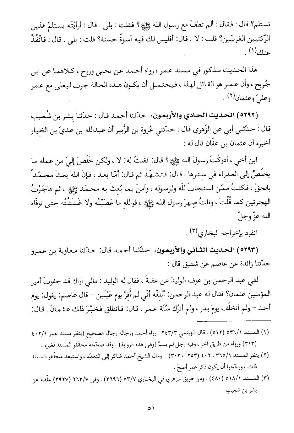 (٥٢٩٢) الحديث الحادي والأربعون: حدّثنا أحمد قال: حدّثنا بِشر بن شُعيب قال: حدّثني أبي عن الزّهري قال: حدّثني عُروة بن الزُّبير أن عبد اللَّه بن عديّ بن الخِيار أخبره أن عثمان بن عفّان قال له:
