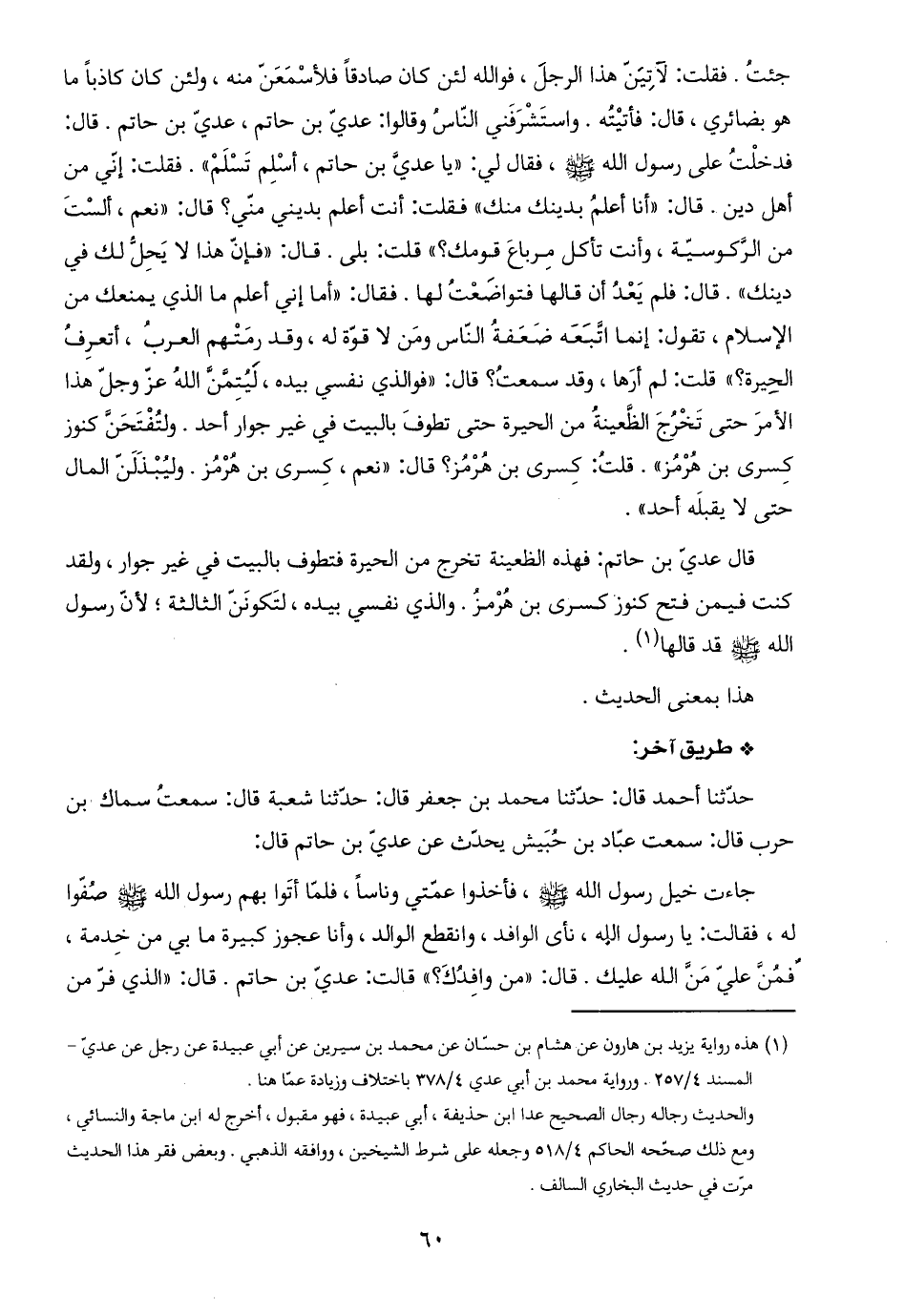 جئتُ. فقلت: لآتِيَنّ هذا الرجلَ، فواللَّه لئن كان صادقًا فلأسْمَعَنّ منه، ولئن كان كاذبًا ما هو بضائري، قال: فأتيْتُه. واستَشْرَفَني النّاسُ وقالوا: عديّ بن حاتم، عديّ بن حاتم. قال: فدخلْتُ على رسول اللَّه -صلى اللَّه عليه وسلم-، فقال لي: "يا عديَّ بن حاتم، أسْلِم تَسْلَمْ". فقلت: إنّي من أهل دين. قال: "أنا أعلمُ بدينك منك" فقلت: أنت أعلم بديني منّي؟ قال: "نعم، ألسْتَ من الرَّكوسيّة، وأنت تأكل مِرباعَ قومك؟ " قلت: بلى. قال: "فإنّ هذا لا يَحِلُّ لك في دينك". قال: فلم يَعْدُ أن قالها فتواضَعْتُ لها. فقال: "أما إني أعلم ما الذي يمنعك من الإسلام، تقول: إنما اتَّبَعَه ضَعَفةُ النّاس ومَن لا قوّة له، وقد رمَتْهم العربُ، أتعرِفُ الحِيرة؟ " قلت: لم أرَها، وقد سمعتُ؟ قال: "فوالذي نفسي بيده، لَيُتِمَّنَّ اللَّه عزّ وجلّ هذا الأمرَ حتى تَخْرُجَ الظَّعينةُ من الحيرة حتى تطوفَ بالبيت في غير جوار أحد. ولتُفْتَحَنَّ كنوز كِسرى بن هُرْمُز". قلتُ: كِسرى بن هُرْمُز؟ قال: "نعم، كِسرى بن هُرْمُز. وليُبْذَلَنّ المال حتى لا يقبلَه أحد".