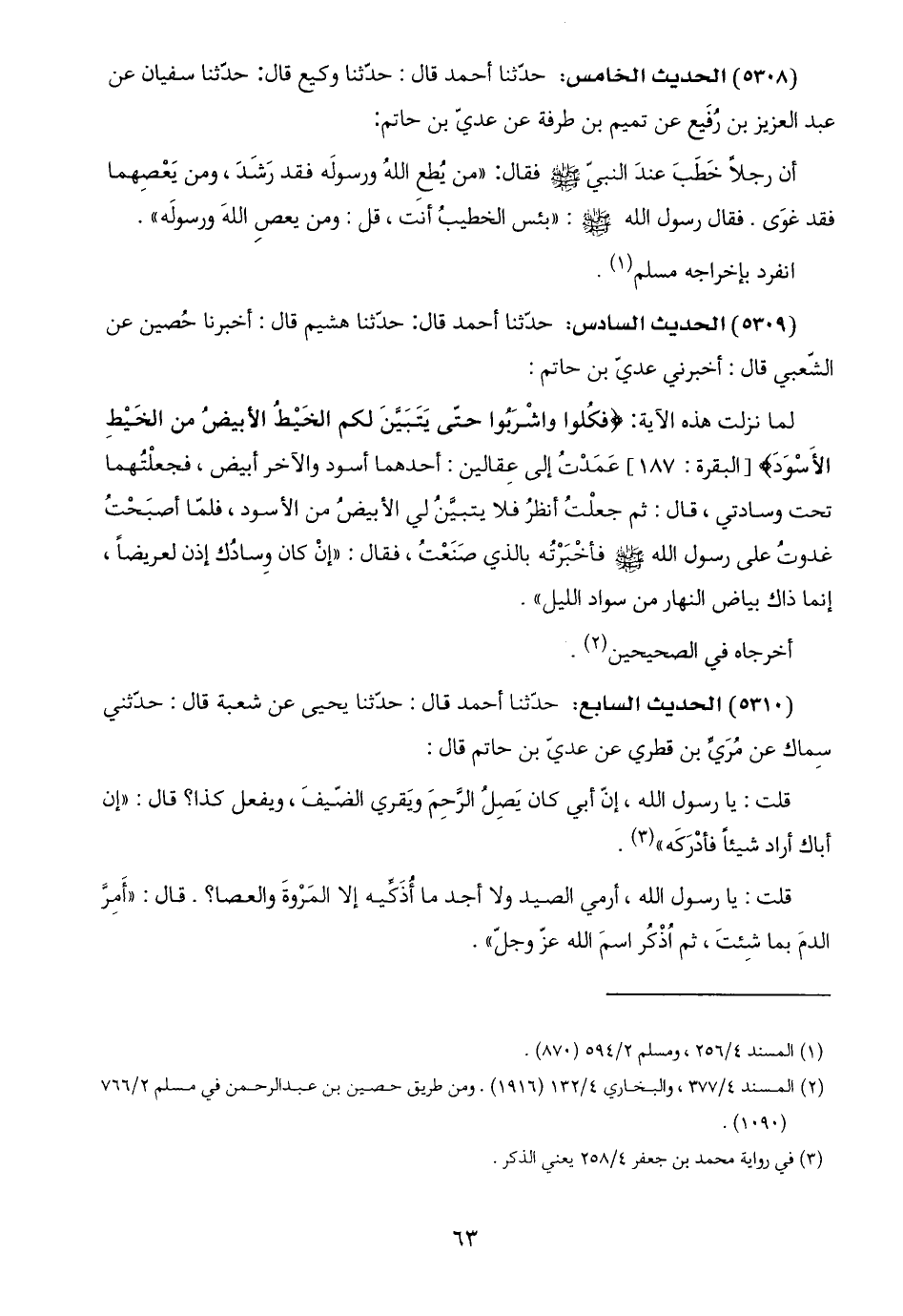 (٥٣٠٩) الحديث السادس: حدّثنا أحمد قال: حدّثنا هشيم قال: أخبرنا حُصين عن الشّعبي قال: أخبرني عديّ بن حاتم: