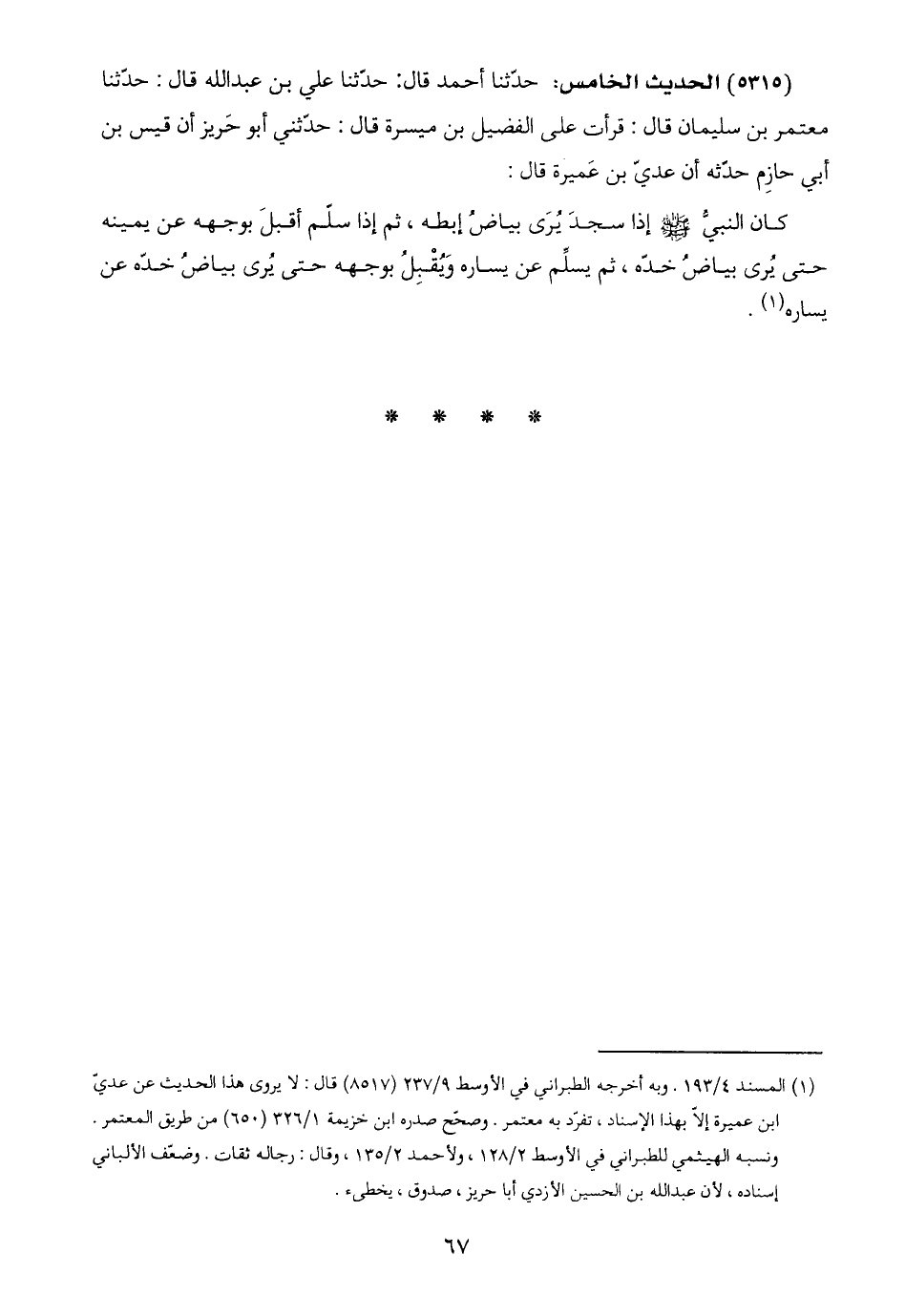 (٥٣١٥) الحديث الخامس: حدّثنا أحمد قال: حدّثنا علي بن عبد اللَّه قال: حدّثنا معتمر بن سليمان قال: قرأت على الفضيل بن ميسرة قال: حدّثني أبو حَريز أن قيس بن أبي حازِم حدّثه أن عديّ بن عَميرة قال: