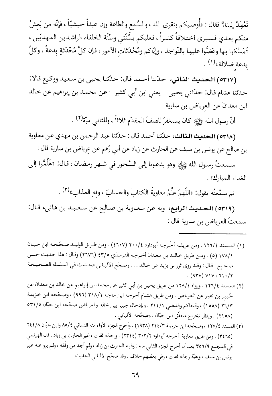 (٥٣١٨) الحديث الثالث: حدّثنا أحمد قال: حدّثنا عبد الرحمن بن مهدي عن معاوية بن صالح عن يونس بن سيف عن الحارث عن زياد عن أبي رُهم عن عِرباض بن سارية قال: