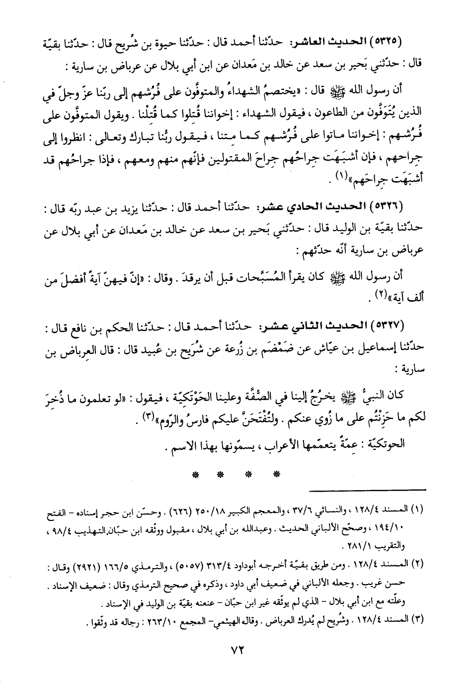 (٥٣٢٥) الحديث العاشر: حدّثنا أحمد قال: حدّثنا حيوة بن شُريح قال: حدّثنا بقيّة قال: حدّثني بَحير بن سعد عن خالد بن مَعدان عن ابن أبي بلال عن عرباض بن سارية: