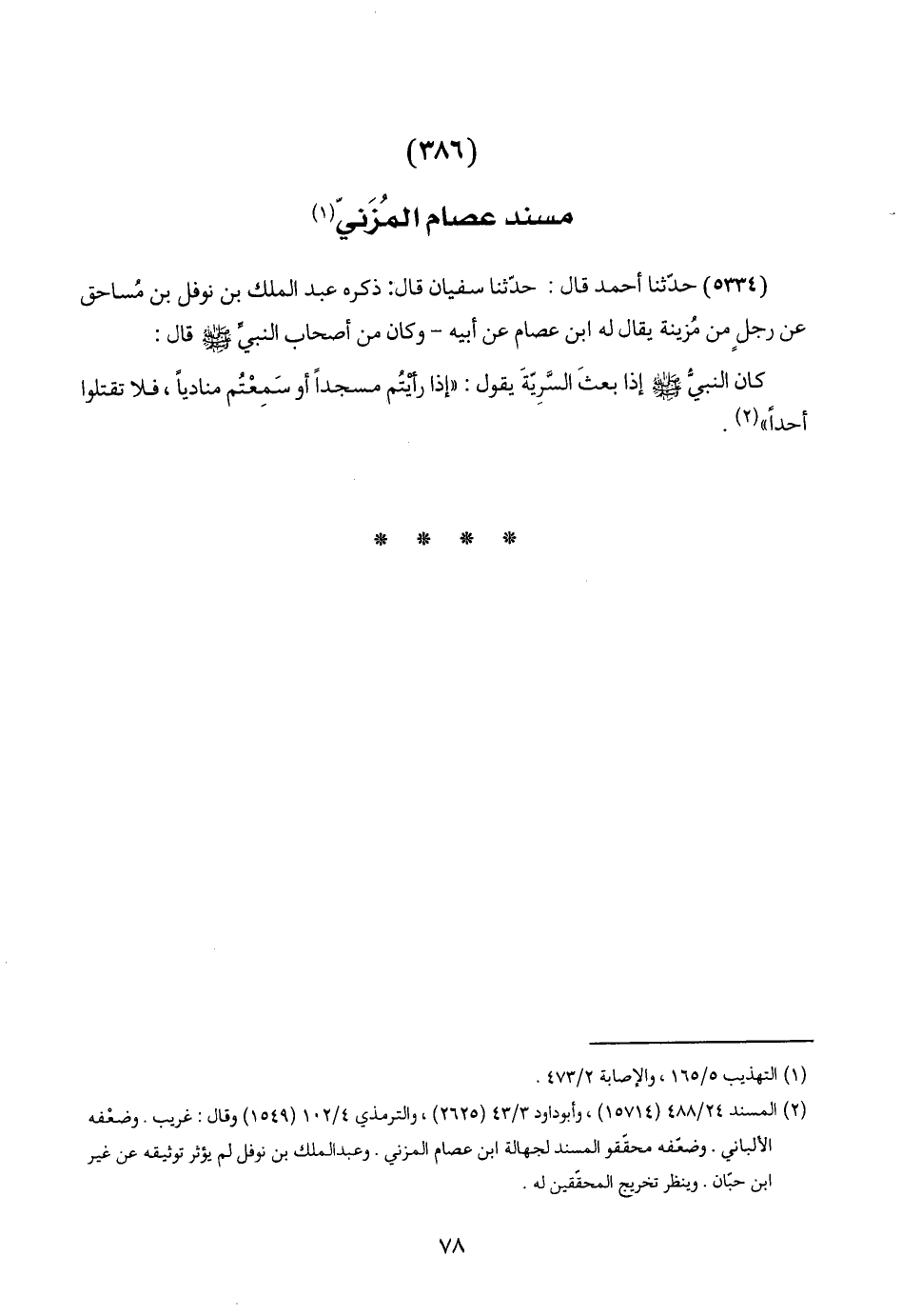 (٥٣٣٤) حدّثنا أحمد قال: حدّثنا سفيان قال: ذكره عبد الملك بن نوفل بن مُساحق عن رجلٍ من مُزينة يقال له ابن عصام عن أبيه - وكان من أصحاب النبيِّ -صلى اللَّه عليه وسلم- قال: