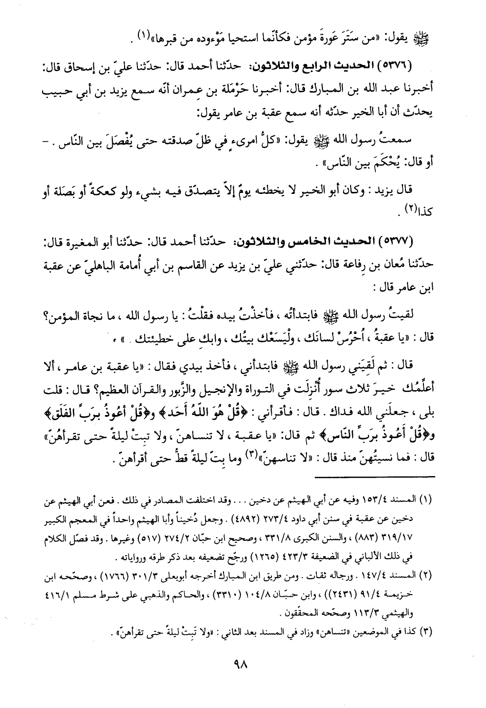 قال: ثم لَقِيَني رسول اللَّه -صلى اللَّه عليه وسلم- فابتدأني، فأخذ بيدي فقال: "يا عقبة بن عامر، ألا أعلِّمُك خيرَ ثلاث سور أُنْزِلَت في التوراة والإنجيل والزَّبور والقرآن العظيم؟ قال: قلت بلى، جعلَني اللَّه فداك. قال: فأقرأني: {قُلْ هُوَ اللَّهُ أَحَدٌ} و {قُلْ أَعُوذُ بِرَبِّ الْفَلَقِ} و {قُلْ أَعُوذُ بِرَبِّ النَّاسِ} ثم قال: "يا عقبة، لا تنساهنّ، ولا تبِتْ ليلةً حتى تقرأهُنّ" قال: فما نسيتُهنّ منذ قال: "لا تناسهنّ" (٣) وما بِتّ ليلةً قطُّ حتى أقرأهنّ.