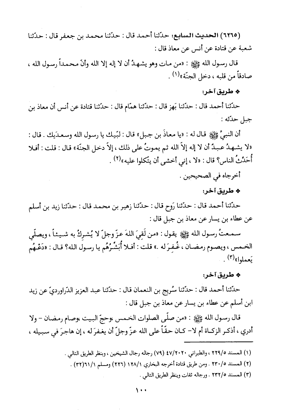 (٦٢٦٥) الحديث السابع: حدّثنا أحمد قال: حدّثنا محمد بن جعفر قال: حدّثنا شعبة عن قتادة عن أنس عن معاذ قال: