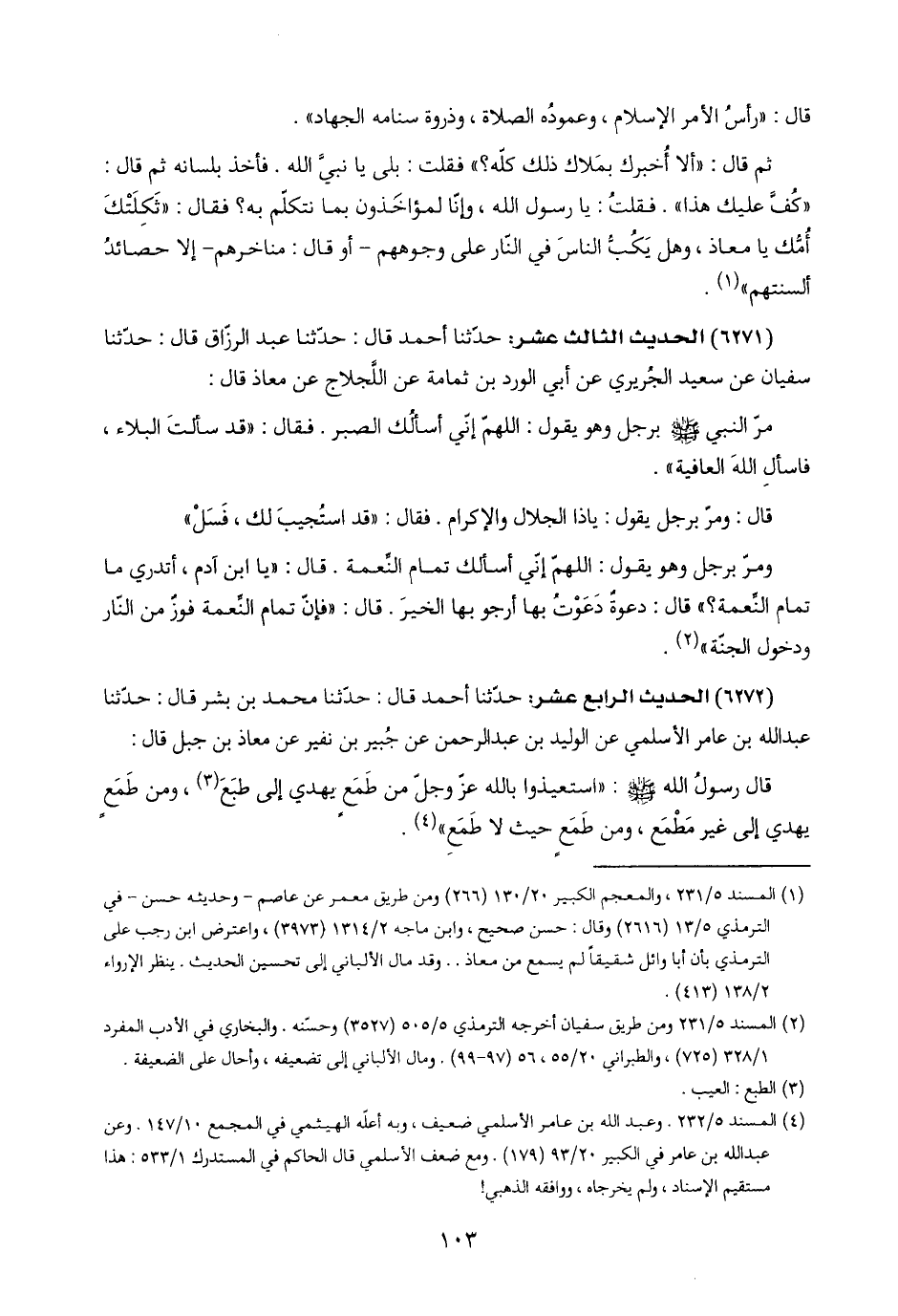 (١) المسند ٥/ ٢٣١، والمعجم الكبير ٢٠/ ١٣٠ (٢٦٦) ومن طريق معمر عن عاصم -وحديثه حسن- في الترمذي ٥/ ١٣ (٢٦١٦) وقال: حسن صحيح، وابن ماجه ٢/ ١٣١٤ (٣٩٧٣)، واعترض ابن رجب على الترمذي بأن أبا وائل شقيقًا لم يسمع من معاذ. . وقد مال الألباني إلى تحسين الحديث. ينظر الإرواء ٢/ ١٣٨ (٤١٣).