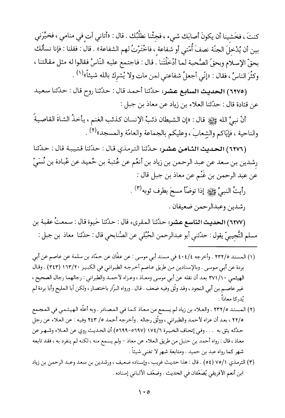 (٢) المسند ٥/ ٢٣٢. والعلاء بن زياد لم يسمع من معاذ كما في المصادر. وبه أعلّه الهيثمي في المجمع ٥/ ٢٢، بعد أن عزاه لأحمد والطبراني، ووثّق رجاله - وأخرجه أحمد ٥/ ٢٤٣ وفيه: عن العلاء عن رجل حدّثه يثق به. . . وفي إتحاف الخيرة ٦/ ١٧٤ (٥٦٩٧ - ٥٦٩٩) أن الحديث روي عن العلاء وشهر عن معاذ، قال: رواه أحمد بن حنبل من طريق العلاء عن معاذ - ولم يسمع منه، لكنه لم ينفرد به، فقد تابعه شهر كما رواه عبد بن حميد. ومتابعة شهر لا تغني شيئًا.