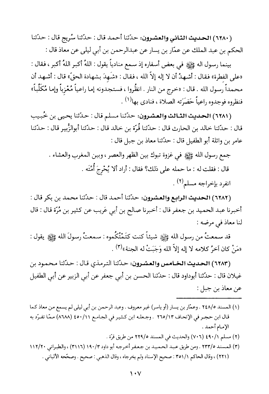 (٦٢٨١) الحديث الثالث والعشرون: حدّثنا مسلم قال: حدّثنا يحيى بن خُبيب قال: حدّثنا خالد بن الحارث قال: حدّثنا قُرّة بن خالد قال: حدّثنا أبو الزُّبير قال: حدّثنا عامر بن واثلة أبو الطفيل قال: حدّثنا معاذ بن جبل قال: