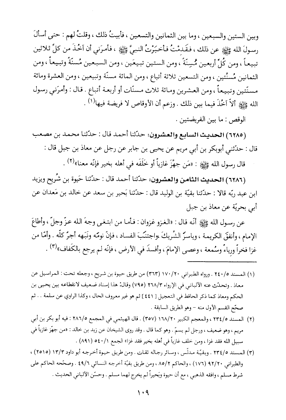 (٣) المسند ٥/ ٢٣٤. وبقيّة مدلّس، وسائر رجاله ثقات. ومن طريق حيوة أخرجه أبو داود ٣/ ١٣ (٢٥١٥)، والطبراني ٢٠/ ٩٢ (١٧٦)، والحاكم ٢/ ٨٥، ومن طريق بقيّة أخرجه النسائي ٦/ ٤٩. وصحّحه الحاكم على شرط مسلم، وافقه الذهبي، مع أن حيوة وبَحيرًا لم يخرج لهما مسلم. وحسّن الألباني الحديث.