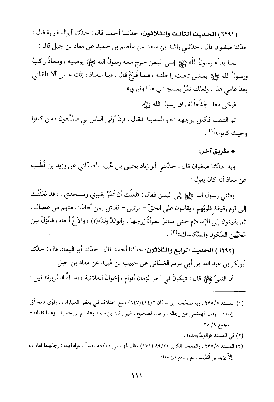 (٣) المسند ٥/ ٢٣٥، والمعجم الكبير ٢٠/ ٨٩ (١٧١)، قال الهيثمي ١٠/ ٥٨ بعد أن عزاه لهما: رجالهما ثقات، إلّا يزيد بن قُطيب، لم يسمع من معاذ.