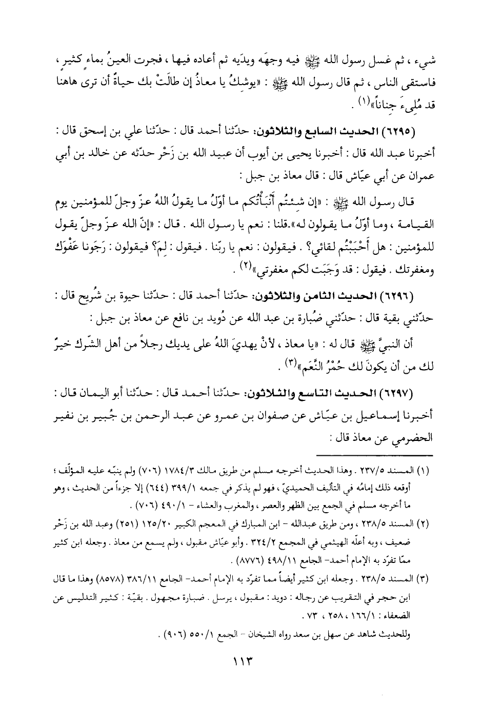(٢) المسند ٥/ ٢٣٨، ومن طريق عبد اللَّه - ابن المبارك في المعجم الكبير ٢٠/ ١٢٥ (٢٥١) وعبد اللَّه بن زَحْر ضعيف، وبه أعلّه الهيثمي في المجمع ٢/ ٣٢٤. وأبو عيّاش مقبول، ولم يسمع من معاذ. وجعله ابن كثير ممّا تفرّد به الإمام أحمد - الجامع ١١/ ٤٩٨ (٨٧٧٦).