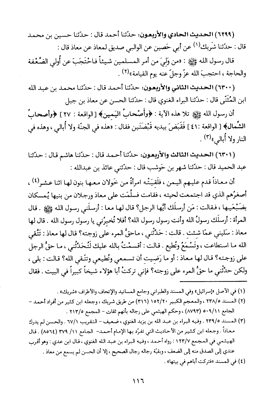 (٣) المسند ٥/ ٢٣٩. وفيه البراء بن عبد اللَّه بن يزيد الغنوي، ضعيف - التقريب ١/ ٦٧. والحسن لم يدرك معاذًا. وجعله ابن كثير من الأحاديث التي تفرّد بها الإمام أحمد - الجامع ١١/ ٣٧٩ (٨٥٦٤). قال الهيثمي في المجمع ٧/ ١٢٣، رواه أحمد، وفيه البراء بن عبد اللَّه الغنوي، قال ابن عدي: وهو أقرب عندي إلى الصدق منه إلى الضعف، وبقيّة رجاله رجال الصحيح، إلّا أن الحسن لم يسمع من معاذ.