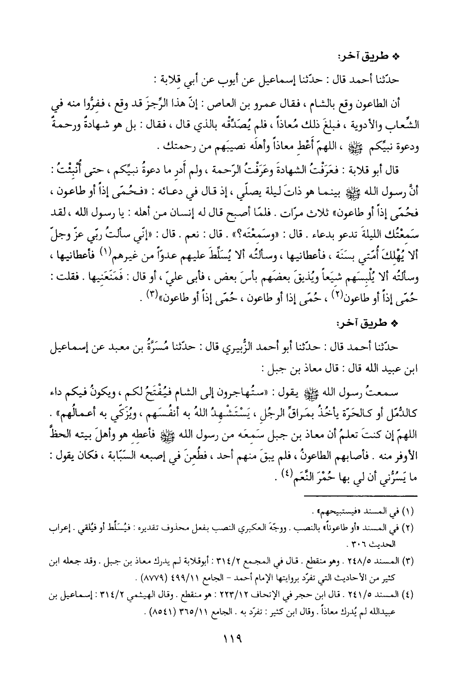 (٣) المسند ٥/ ٢٤٨. وهو منقطع. قال في المجمع ٢/ ٣١٤: أبو قلابة لم يدرك معاذ بن جبل. وقد جعله ابن كثير من الأحاديث التي تفرّد بروايتها الإمام أحمد - الجامع ١١/ ٤٩٩ (٨٧٧٩).