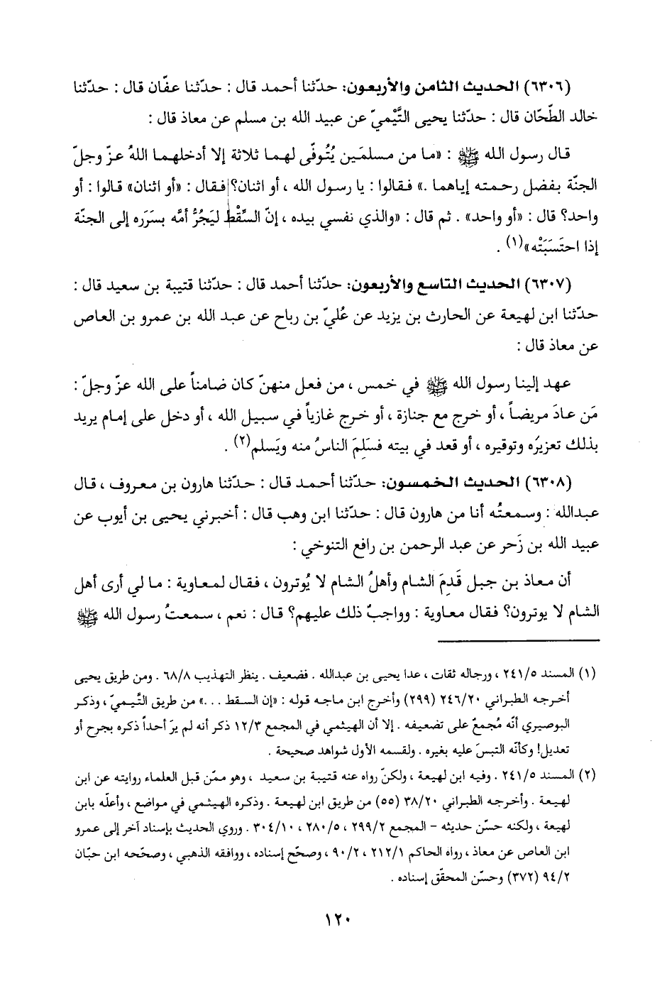 (٦٣٠٦) الحديث الثامن والأربعون: حدّثنا أحمد قال: حدّثنا عفّان قال: حدّثنا خالد الطّحّان قال: حدّثنا يحيى التَّيْميّ عن عبيد اللَّه بن مسلم عن معاذ قال: