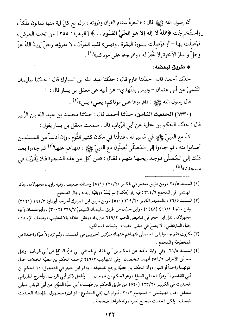 (٤) المسند ٥/ ٢٦. وفي رواية بعدها عن الحكم بن أبي القاسم الحنفي أبي عزّة الدبّاغ عن أبي الرباب. ونقل محقّق الأطراف ٦/ ٣٥٩ أنهما شخصان. وفي التهذيب ٢/ ٢٤٦ ترجمة الحكم بن عطيّة الخلاف حول كونهما واحدًا أو اثنين، وأن الحكم بن عطيّة يرجح تضعيفه. وذكر ابن حجر في التعجيل ١٠٠ الحكم بن أبي القاسم، أبو عزّة الحنفي الدباغ، وهو الحكم بن طهمان. . . وأغفل ذكر أبي الرباب. وأخرج الطبراني الحديث في الكبير ٢٠/ ٢٢٣ (٥٢٠) من طريق الحكم بن طهمان أبي عزّة الدبّاغ عن أبي الرباب مولى معقل. قال الهيثمي - المجمع ٢/ ٢٠: أبو الرباب (في المطبوع: الزيات) مجهول. فإسناد الحديث ضعيف. ولكن الحديث صحيح لغيره، وله شواهد صحيحة.