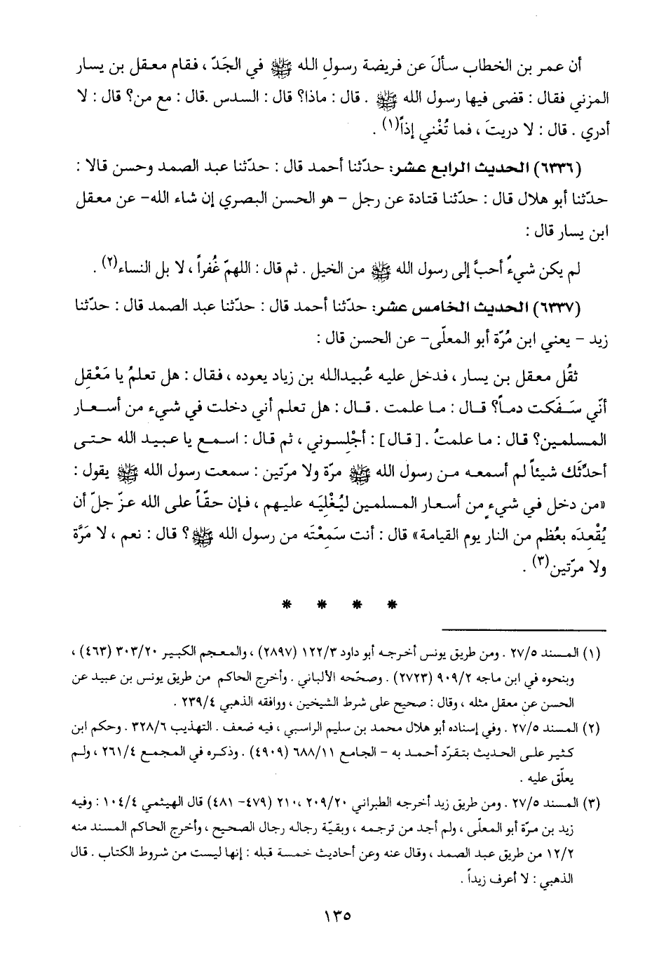 (١) المسند ٥/ ٢٧. ومن طريق يونس أخرجه أبو داود ٣/ ١٢٢ (٢٨٩٧)، والمعجم الكبير ٢٠/ ٣٠٣ (٤٦٣)، وبنحوه في ابن ماجة ٢/ ٩٠٩ (٢٧٢٣). وصحّحه الألباني. وأخرج الحاكم من طريق يونس بن عبيد عن الحسن في معقل مثله، وقال صحيح على شرط الشيخين، ووافقه الذهبي ٤/ ٢٣٩.