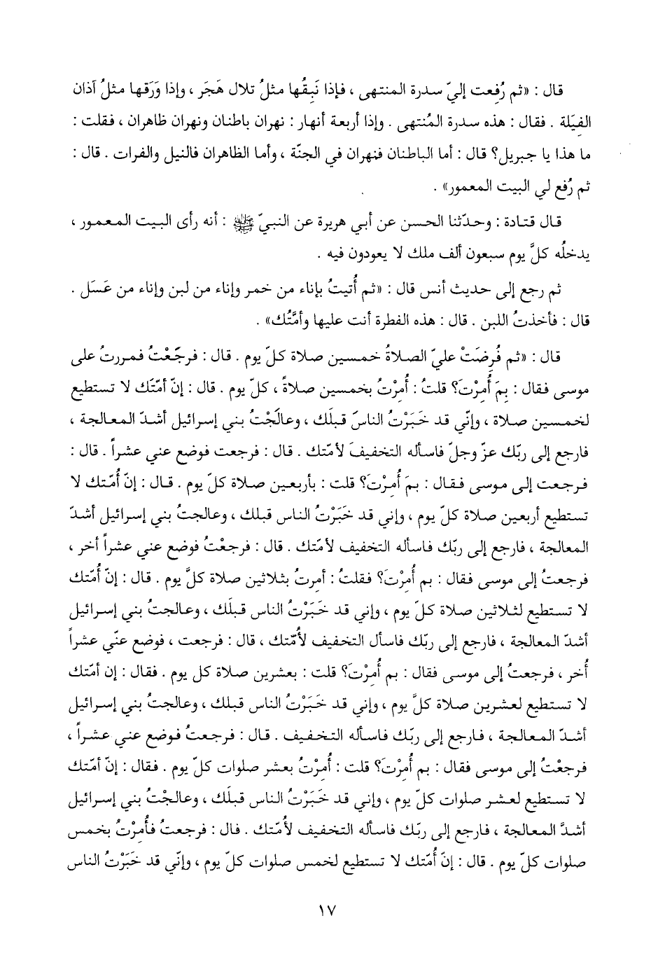 قال: "ثم فُرِضَتْ على الصلاة خمسين صلاة كلَ يوم. قال: فرجَعْتُ فمررتُ على موسى فقال: بِمَ أُمِرْتَ؟ قلتُ: أُمِرْتُ بخمسين صلاةً، كلّ يوم. قال: إنّ أمّتَك لا تستطيع لخمسين صلاة، وإنّي قد خَبَرْتُ النّاسَ قبلَك، وعالَجْتُ بني إسرائيل أشدّ المعالجة، فارجع إلى ربّك عزّ وجلّ فاسأله التخفيفَ لأمّتك. قال: فرجعت فوضع عني عشرًا. قال: فرجعت إلى موسى فقال: بمَ أُمِرْتَ؟ قلت: بأربعين صلاة كلّ يوم. قال: إنّ أُمّتك لا تستطيع أربعين صلاة كلّ يوم، وإني قد خَبَرْتُ النّاس قبلك، وعالجتُ بني إسرائيل أشدّ المعالجة، فارجع إلى ربّك فاسأله التخفيف لأمّتك. قال: فرجعْتُ فوضع عني عشرًا أخر، فرجعتُ إلى موسى فقال: بم أمِرْتَ؟ فقلتُ: أمِرتُ بثلاثين صلاة كلَّ يوم. قال: إنّ أُمّتك لا تستطيع لثلاثين صلاة كلّ يوم، وإني قد خَبَرْتُ النّاس قبلَك، وعالجتُ بني إسرائيل أشدّ المعالجة، فارجع إلى ربّك فاسأل التخفيف لأُمّتك، قال: فرجعت، فوضع عنّي عشرًا أُخر، فرجعتُ إلى موسى فقال: بم أُمِرْتَ؟ قلت: بعشرين صلاة كل يوم. فقال: إنّ أمّتك لا تستطيع لعشرين صلاة كلَّ يوم، وإني قد خَبَرْتُ النّاس قبلك، وعالجتُ بني إسرائيل أشدّ المعالجة، فارجع إلى ربّك فاسأله التخفيف. قال: فرجعتُ فوضع عني عشرًا، فرجعْتُ إلى موسى فقال: بم أُمِرْتَ؟ قلت: أُمِرْتُ بعشر صلوات كلّ يوم. فقال: إنّ أمّتك لا تستطيع لعشر صلوات كلّ يوم، وإني قد خَبَرْتُ النّاس قبلَك، وعالجْتُ بني إسرائيل أشدَّ المعالجة، فارجع إلى ربّك فاسأله التخفيف لأُمّتك. قال: فرجعتُ فأُمِرْتُ بخمس صلوات كلّ يوم. قال: إنّ أُمّتك لا تستطيع لخمس صلوات كلّ يوم، وإنّي قد خَبَرْتُ النّاس