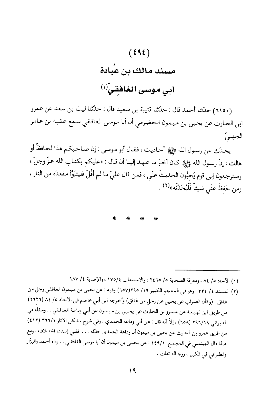 (٤٩٤) مسند مالك بن عُبادة أبي موسى الغافِقيّ (١)