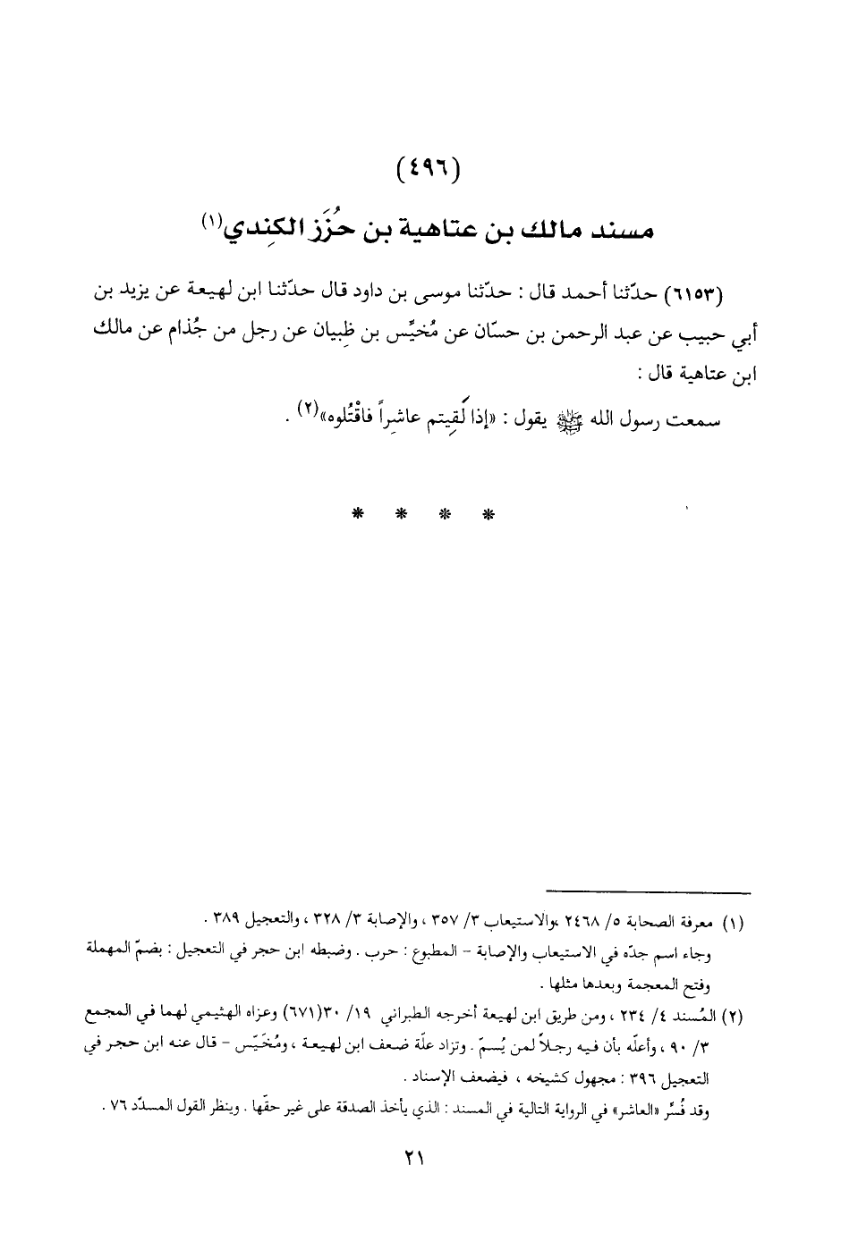 (٦١٥٣) حدّثنا أحمد قال: حدّثنا موسى بن داود قال حدّثنا ابن لهيعة عن يزيد بن أبي حبيب عن عبد الرحمن بن حسّان عن مُخيِّس بن ظِبيان عن رجل من جُذام عن مالك ابن عتاهية قال: