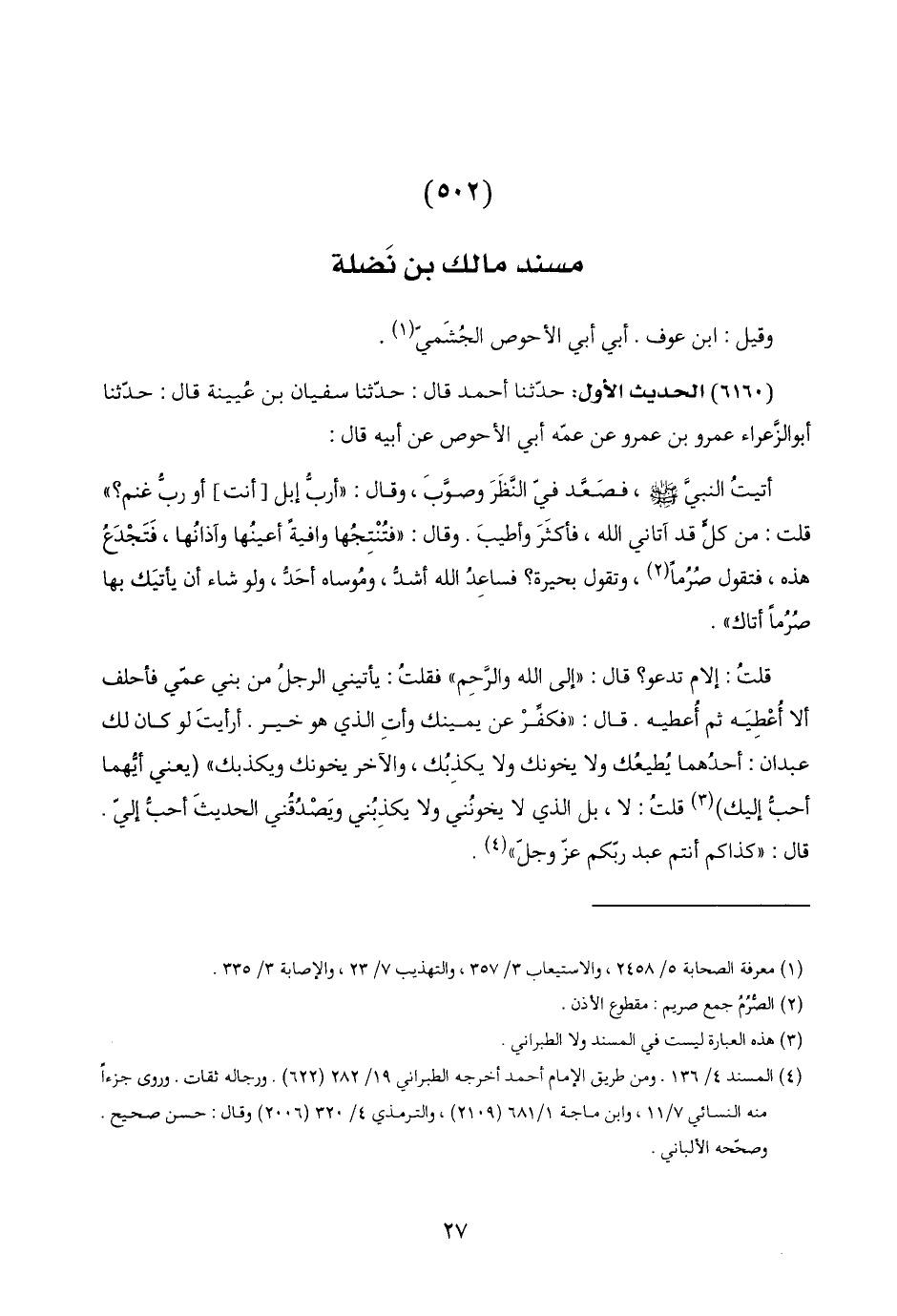 (٦١٦٠) الحديث الأول: حدّثنا أحمد قال: حدّثنا سفيان بن عُيينة قال: حدّثنا أبو الزَّعراء عمرو بن عمرو عن عمّه أبي الأحوص عن أبيه قال:
