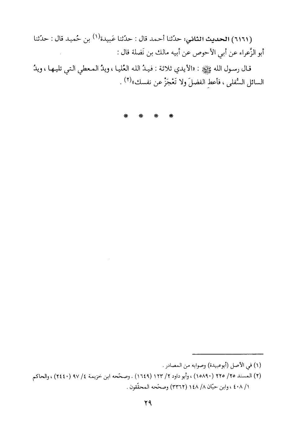 (٦١٦١) الحديث الثاني: حدّثنا أحمد قال: حدّثنا عَبيدة (١) بن حُميد قال: حدّثنا أبو الزَّعراء عن أبي الأحوص عن أبيه مالك بن نَضلة قال: