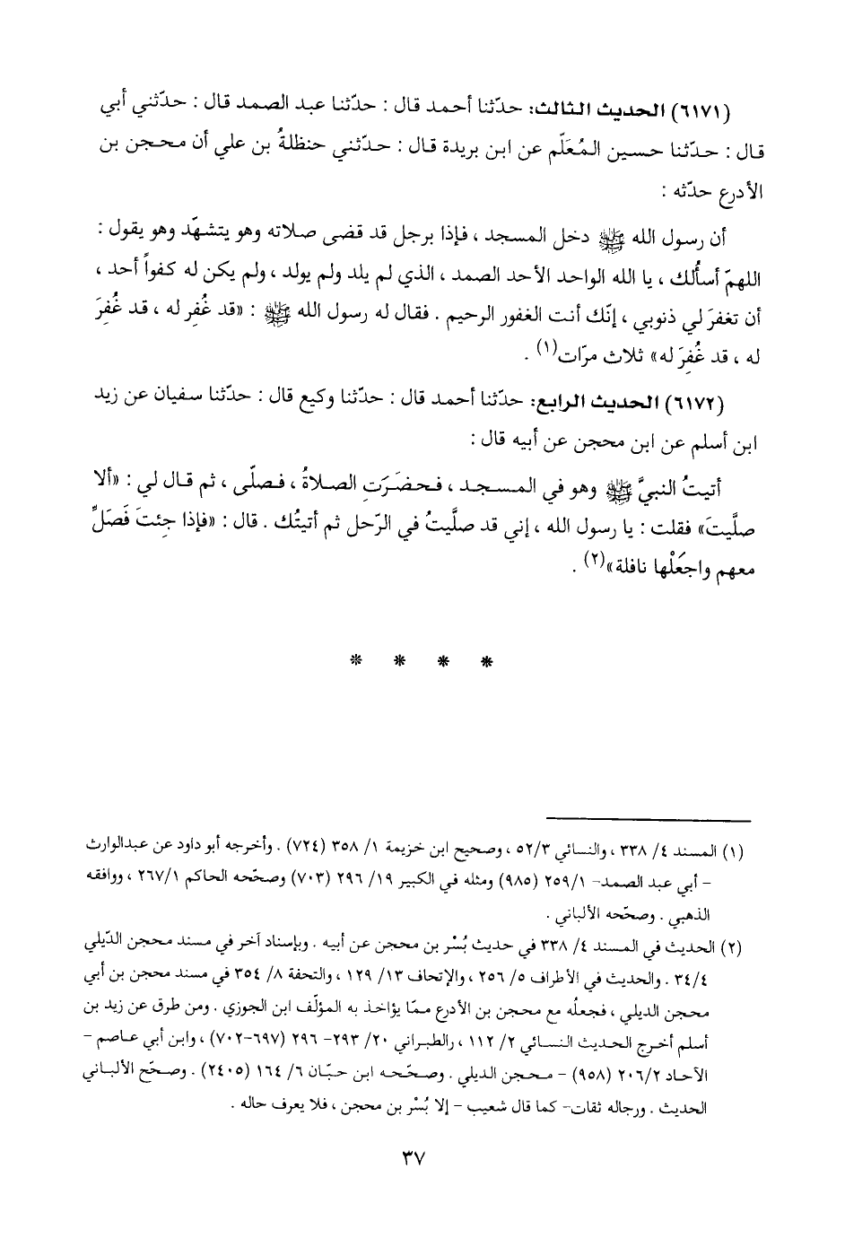 (٦١٧١) الحديث الثالث: حدّثنا أحمد قال: حدّثنا عبد الصمد قال: حدّثني أبي قال: حدّثنا حسين المُعَلّم عن ابن بريدة قال: حدّثني حنظلةُ بن علي أن محجن بن الأدرع حدّثه:
