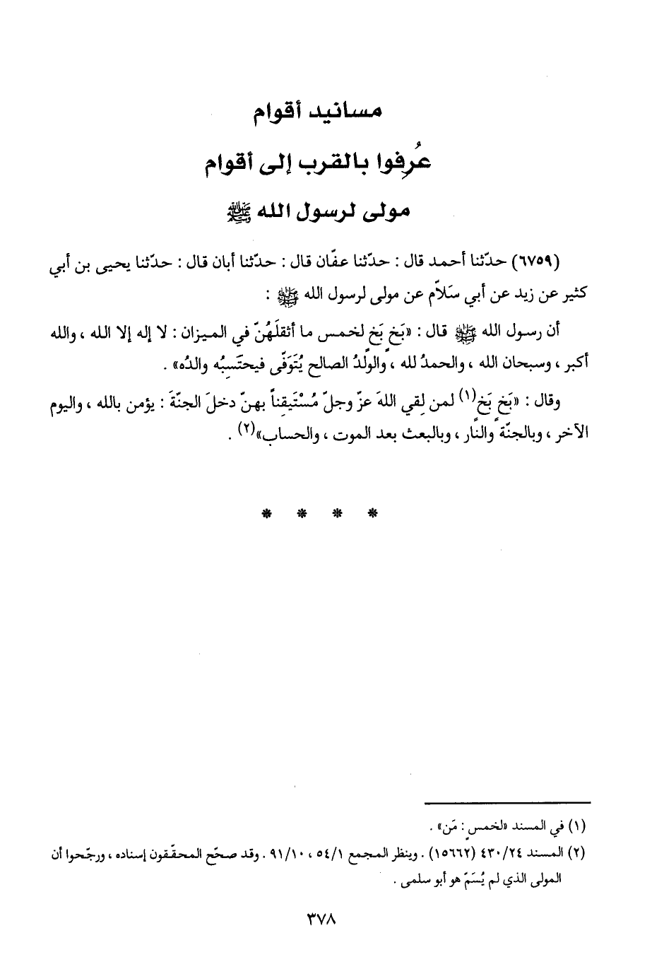 (٢) المسند ٢٤/ ٤٣٠ (١٥٦٦٢). وينظر المجمع ١/ ٥٤، ١٠/ ٩١. وقد صحّح المحقّقون إسناده، ورجّحوا أن